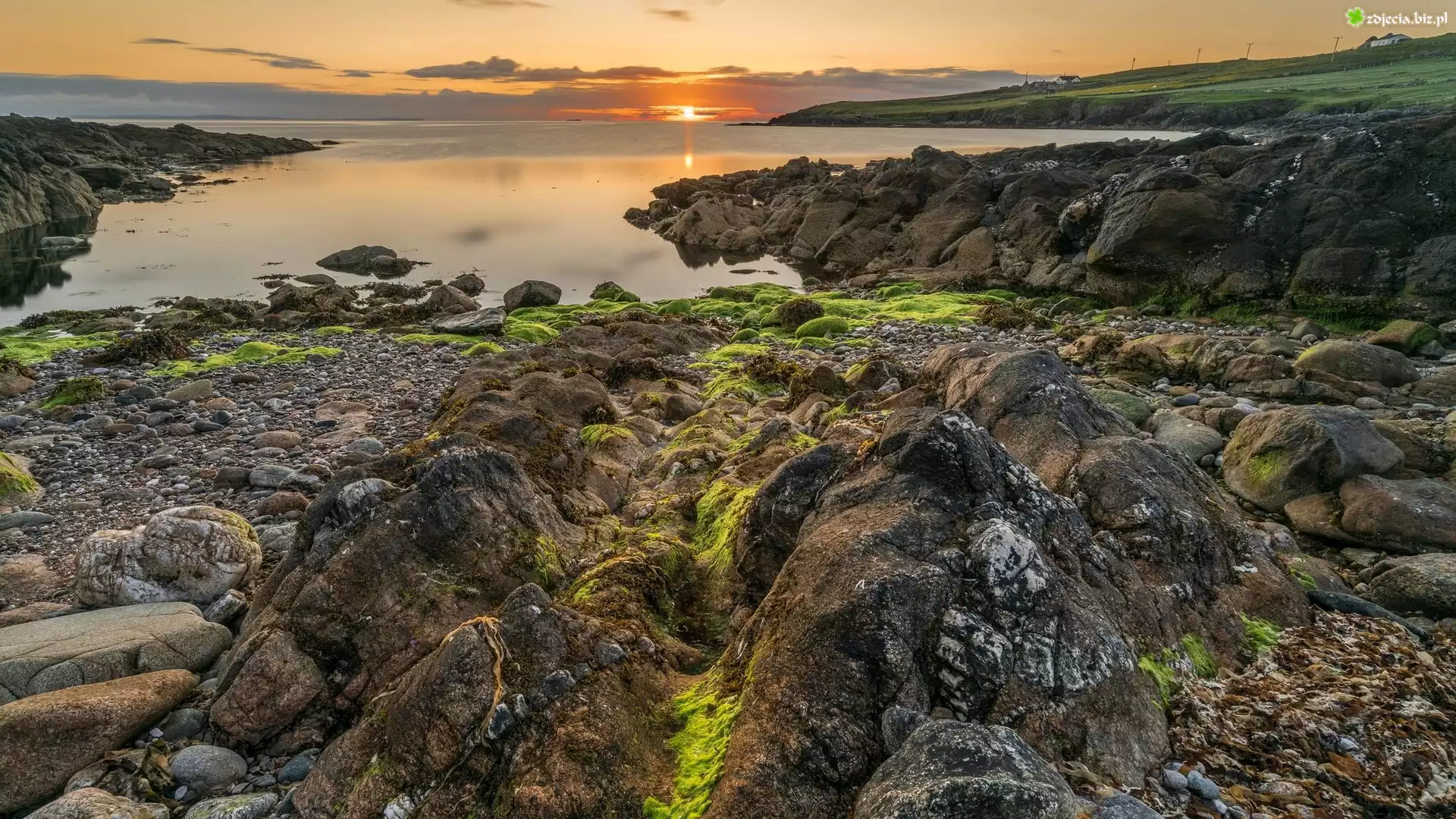 Zdjęcie Szkocja, Szetlandy, Wyspa Whalsay, Osada Skaw, Morze Północne, Kamienie, Wschód słońca, Skały |