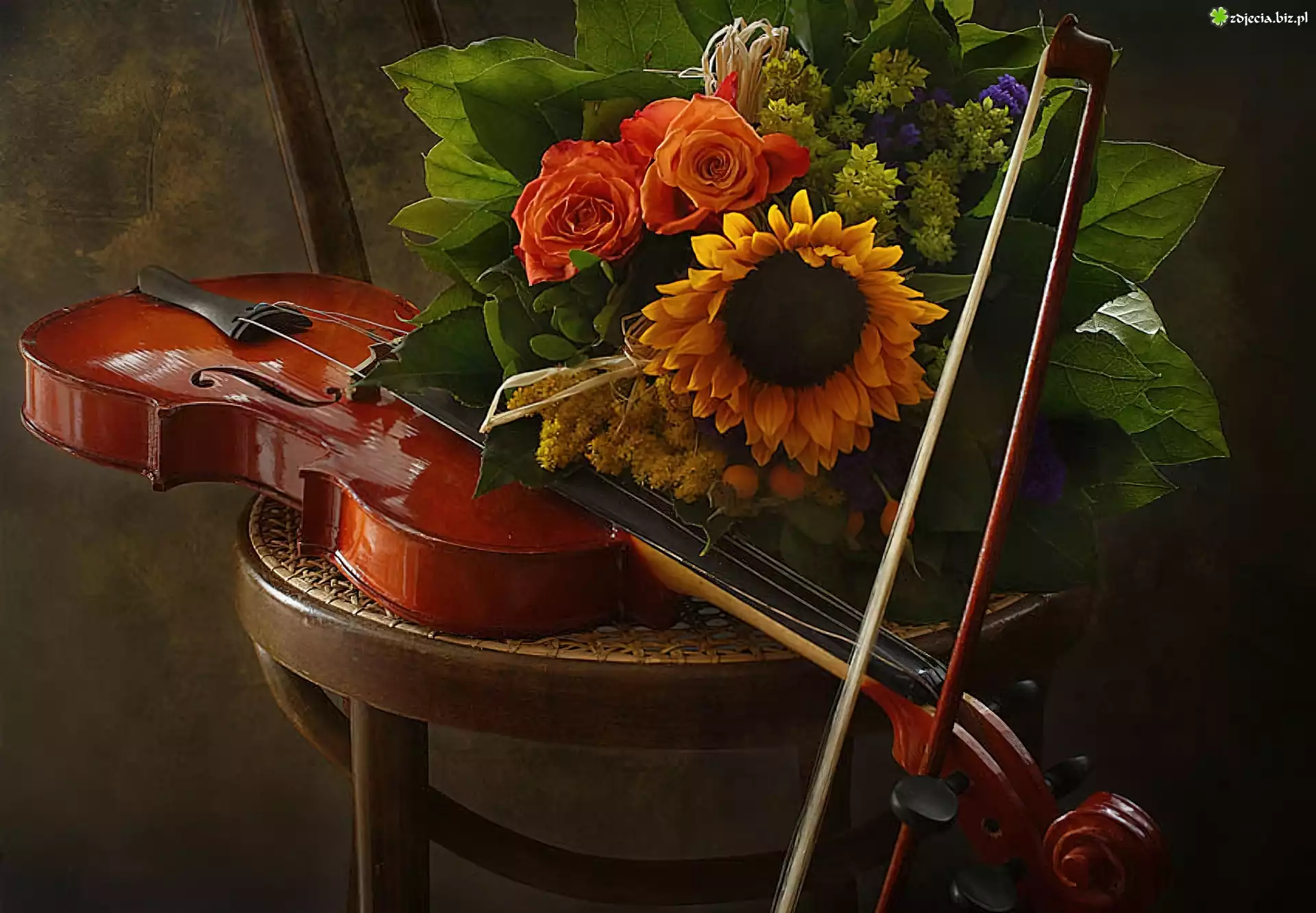 Zdjęcie, Skrzypce, Smyczek, Wiązanka, Kwiatów