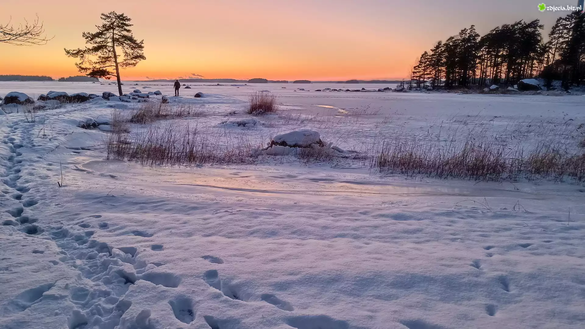 Zdjęcie Zima, Jezioro, Śnieg, Ślady, Zachód słońca, Drzewa