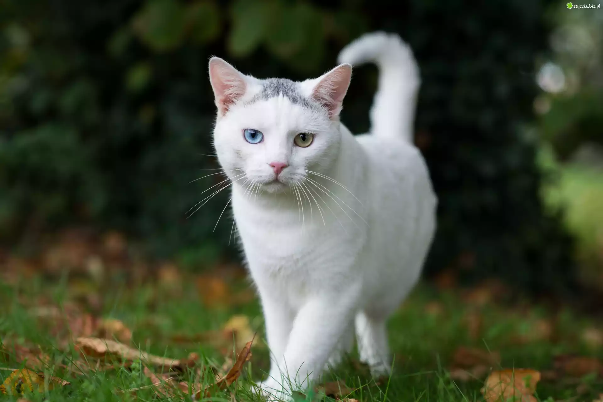 Zdjęcie Biały, Słodki, Kotek, Las, Drzewa, Jesienne, Liście