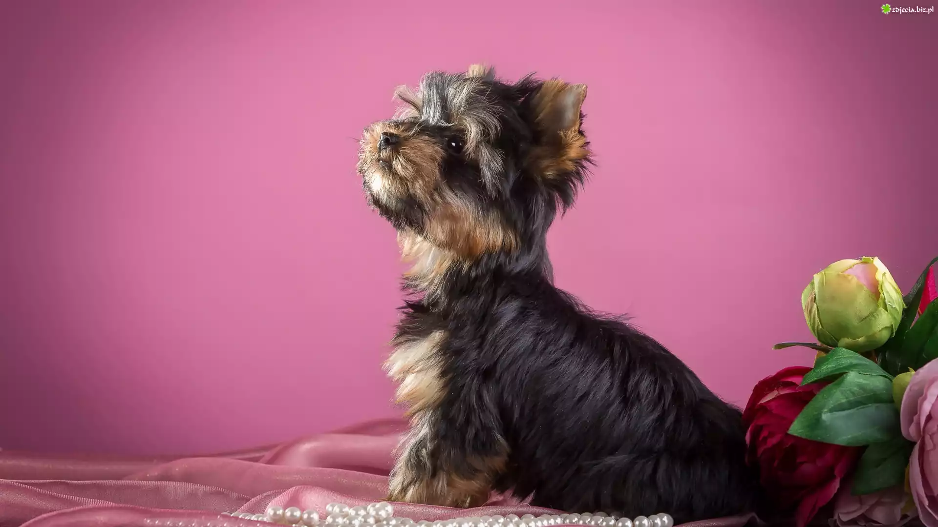 Zdjęcie Słodki, Yorkshire terrier, Kwiaty, Perły