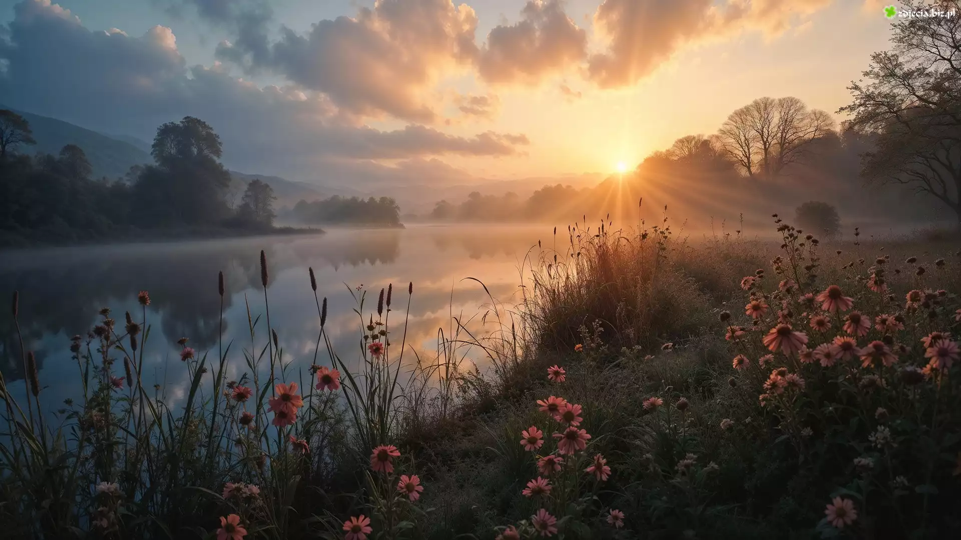 Zdjęcie Kwiaty, Jezioro, Promienie słońca, Grafika AI