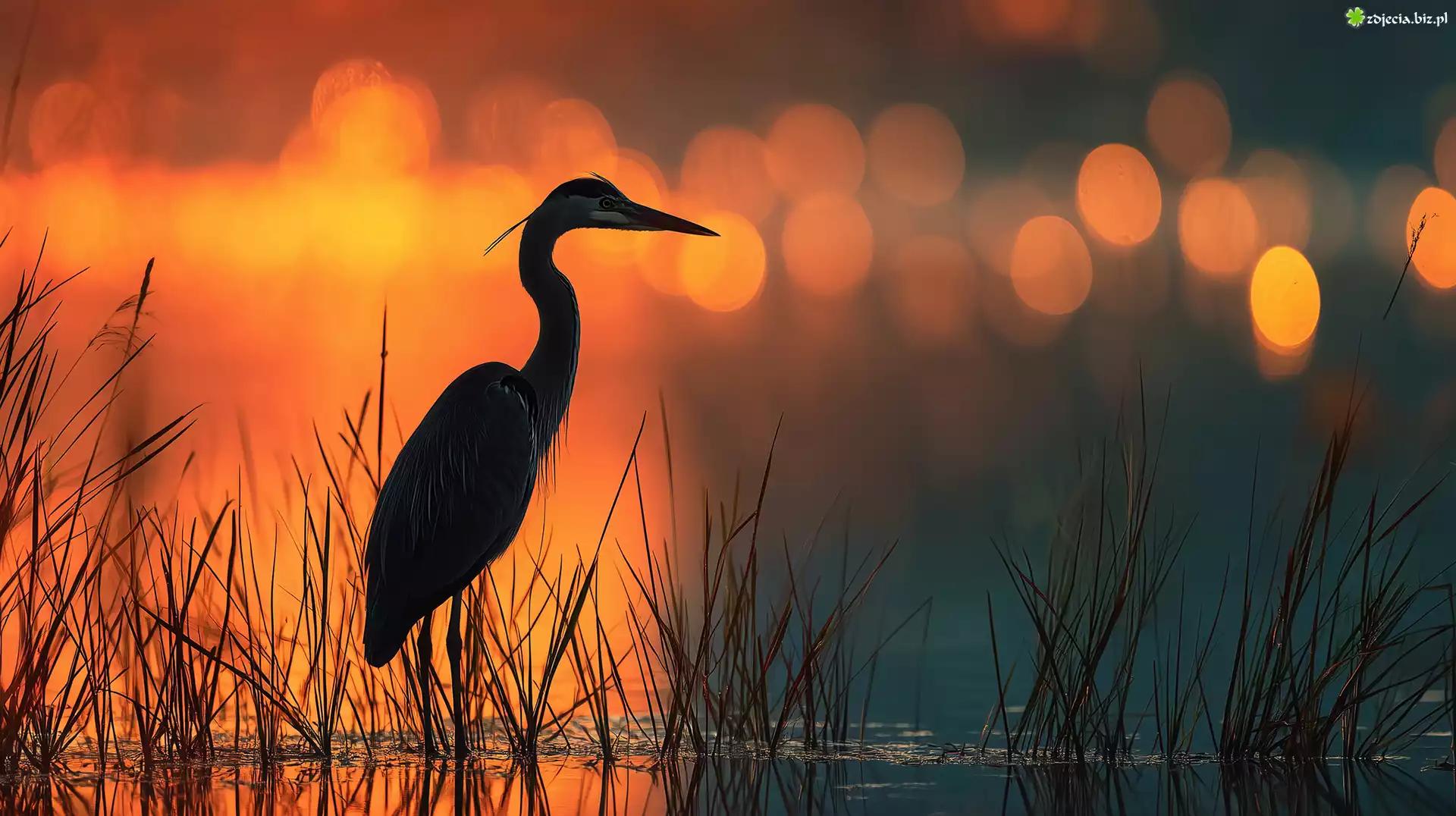 Zdjęcie Czapla, Trawa, Zachód słońca, Grafika AI