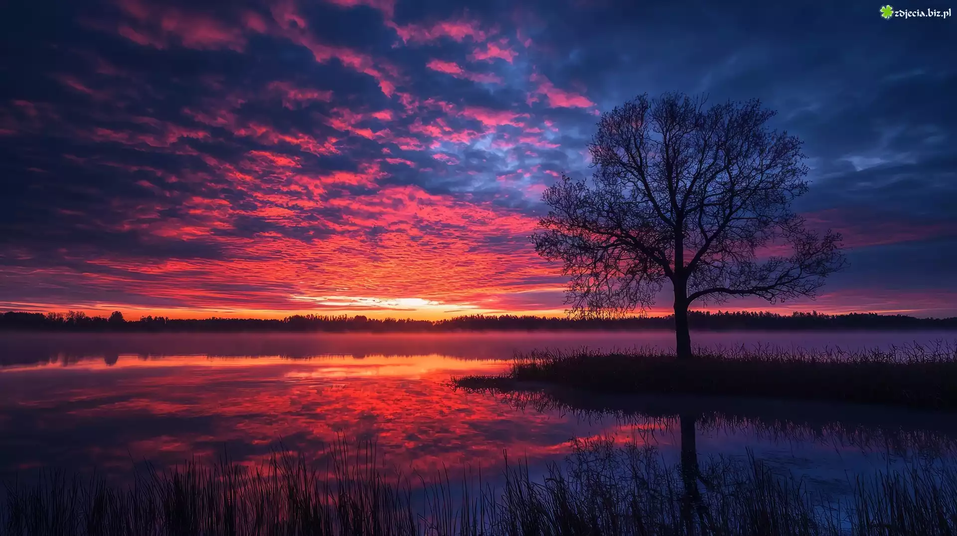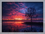 Zdjęcie, Jezioro, Drzewo, Zachód słońca, Grafika AI