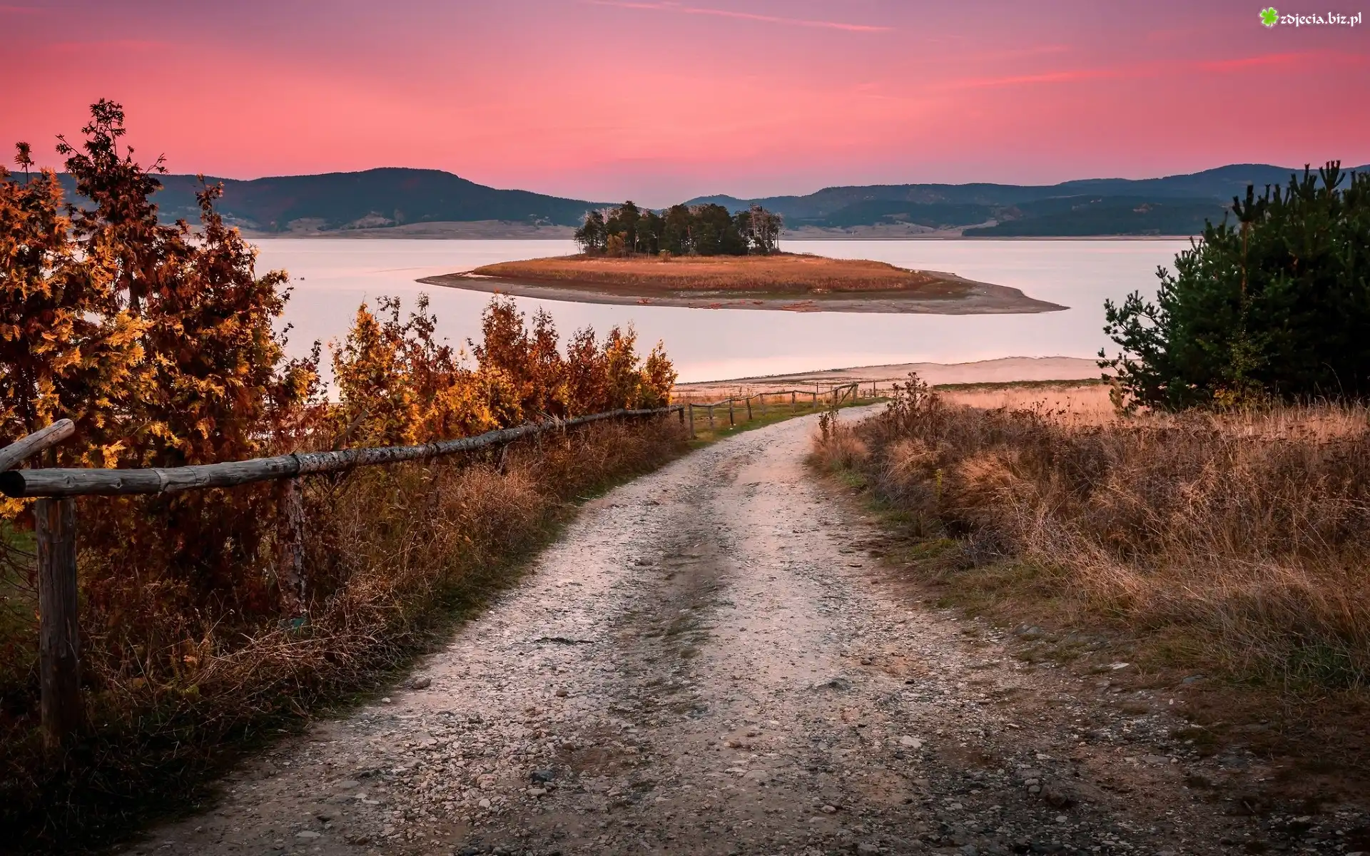 Zdjęcie Jesień, Zachód słońca, Jezioro Batak, Wysepka, Góry, Droga, Ogrodzenie, Drzewa, Bułgaria |