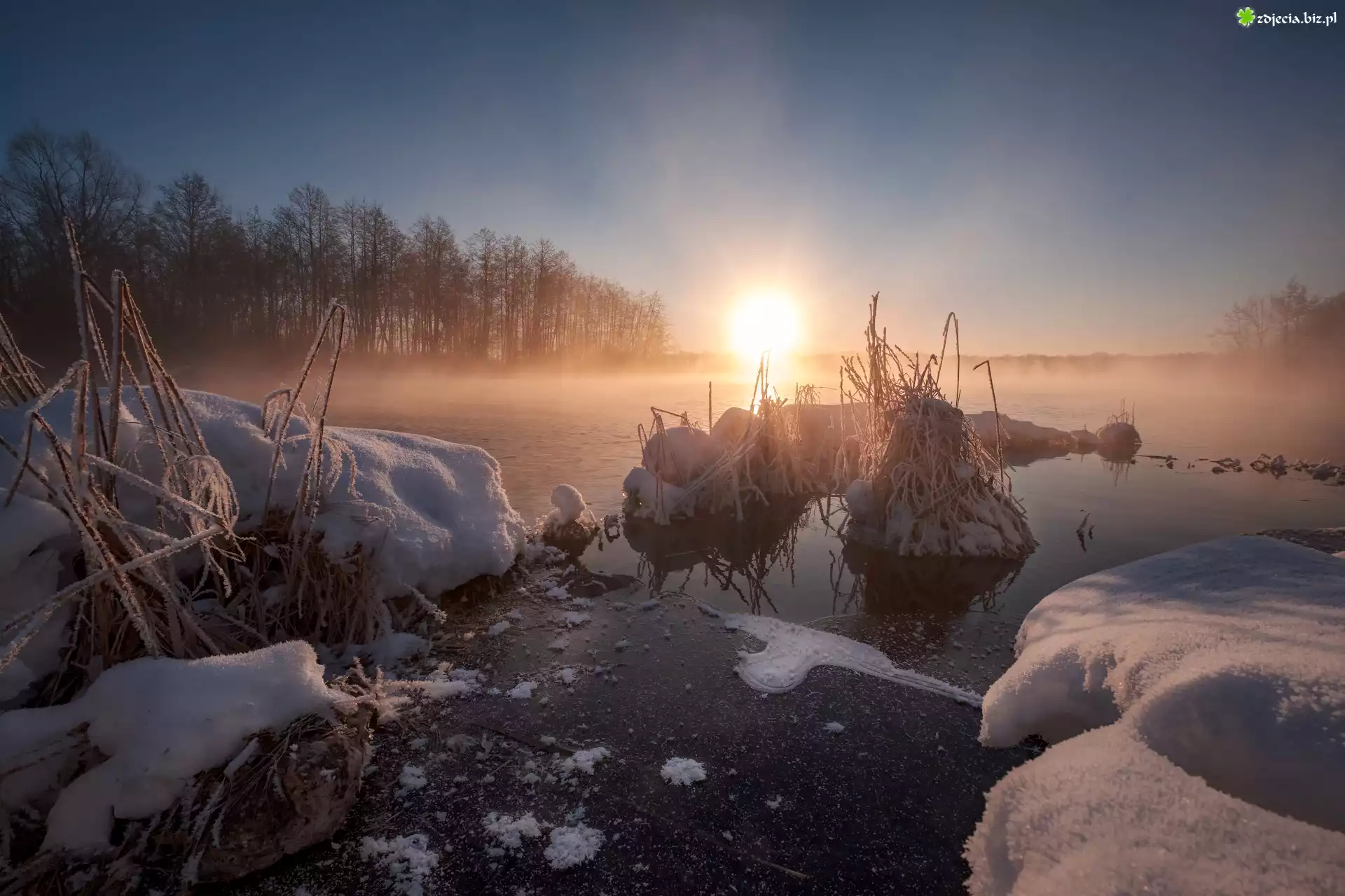 Zdjęcie Zima, Zachód słońca, Jezioro Białe, Drzewa, Mgła, Szatura, Obwód moskiewski, Rosja