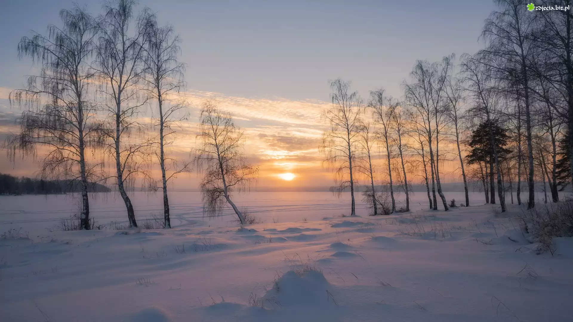 Zdjęcie Zima, Śnieg, Zachód słońca, Drzewa, Brzozy