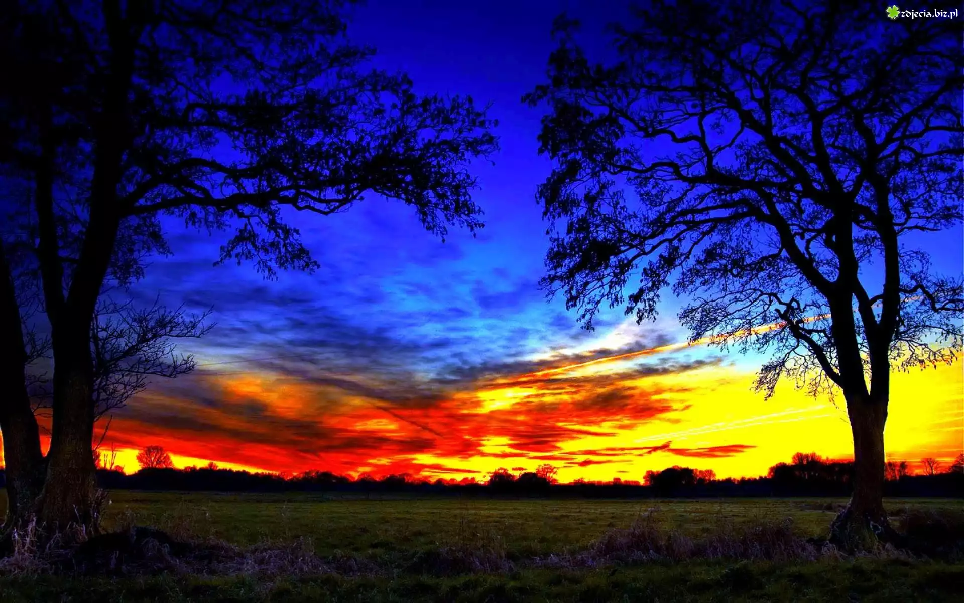 Zdjęcie Łąka, Chmury, Zachód Słońca, Drzewa