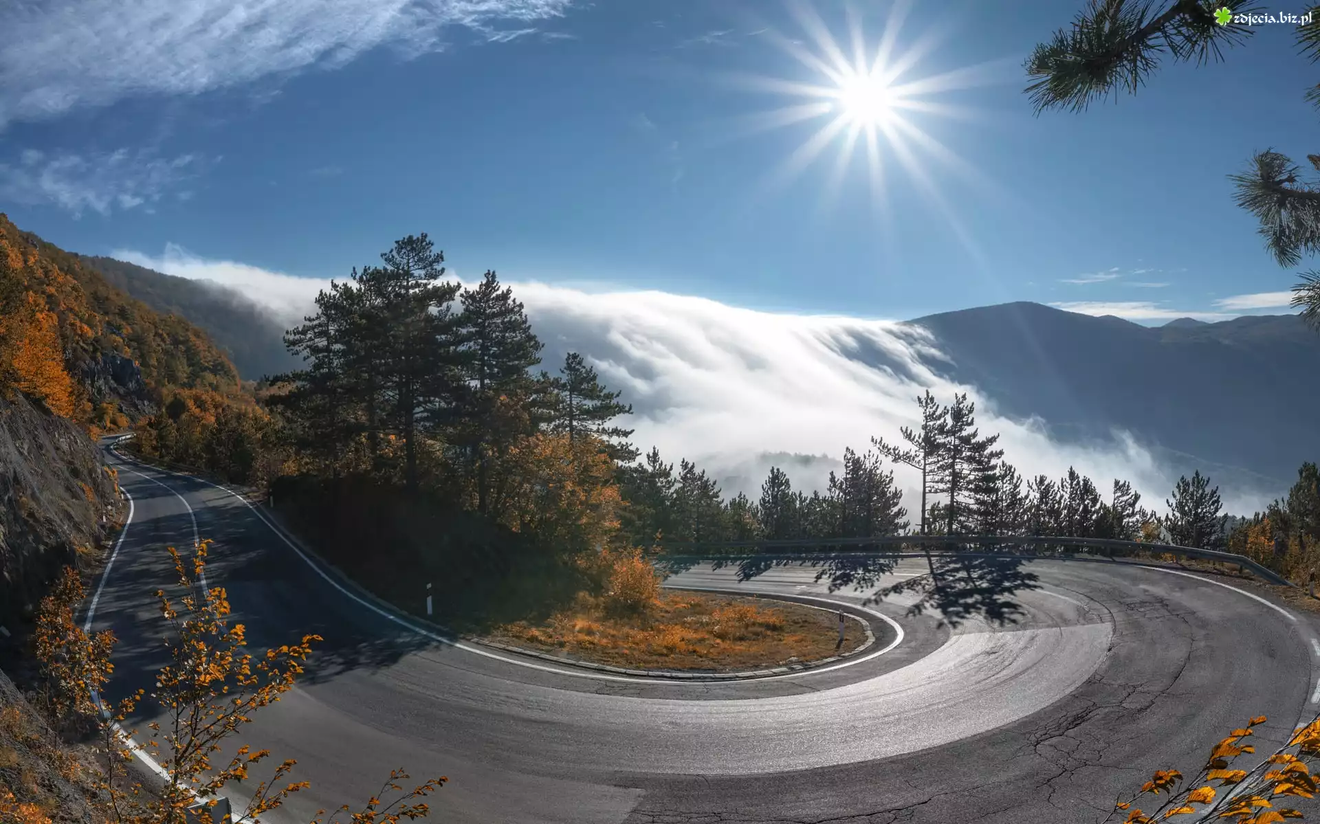 Zdjęcie Góry, Las, Drzewa, Jesień, Droga, Mgła, Promienie słońca