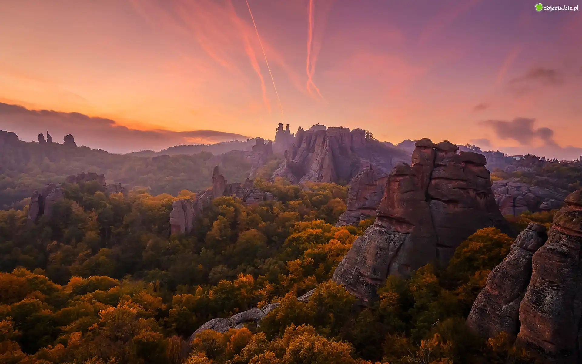 Zdjęcie Jesień, Las, Drzewa, Chmury, Góry, Skały, Zachód słońca
