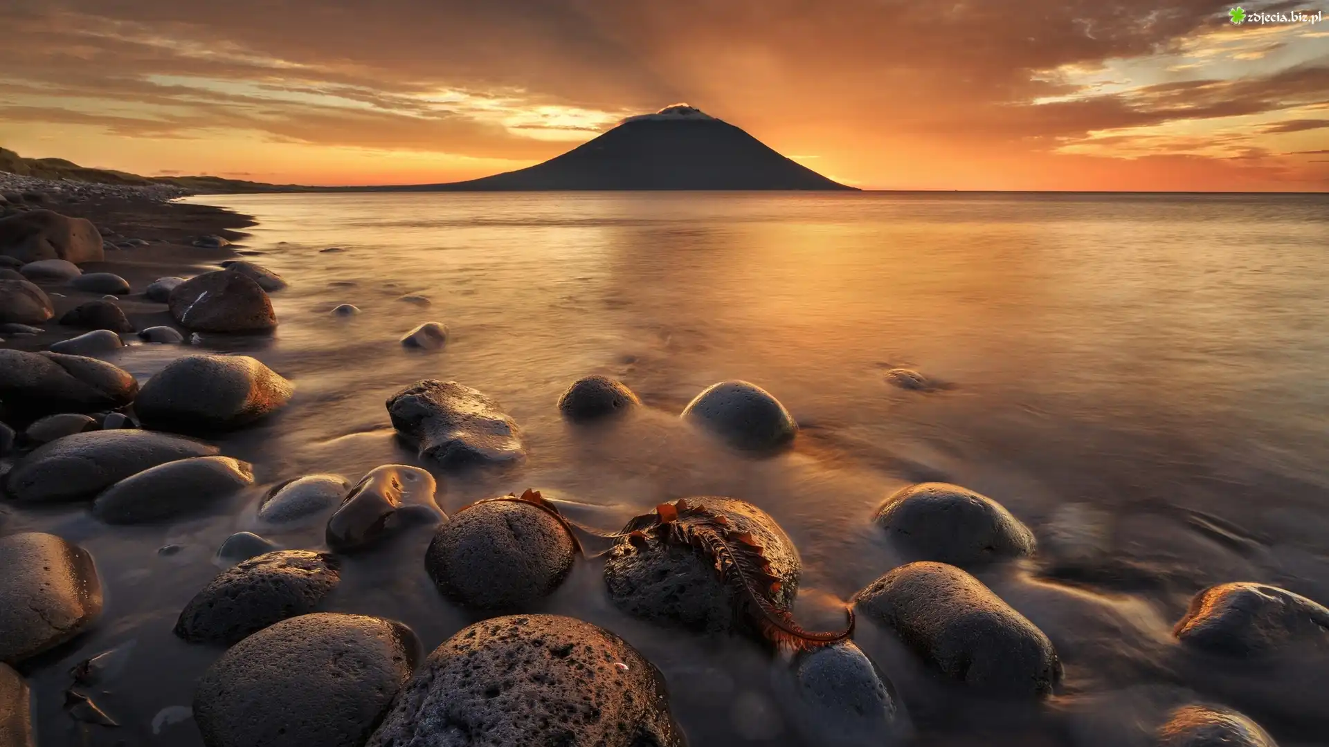 Zdjęcie Góra, Stratowulkan Atsonupuri, Zachód słońca, Morze, Kamienie, Wyspy Kurylskie, Wyspa Iturup, Obwód sachaliński, Rosja |