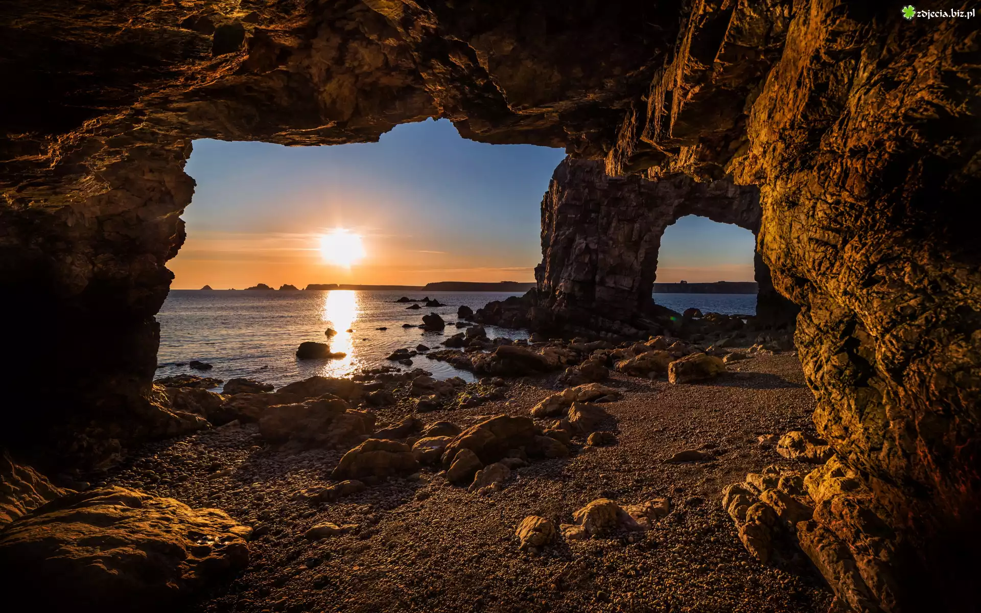 Zdjęcie Morze, Brzeg, Grota, Skała, Kamienie, Niebo, Zachód słońca