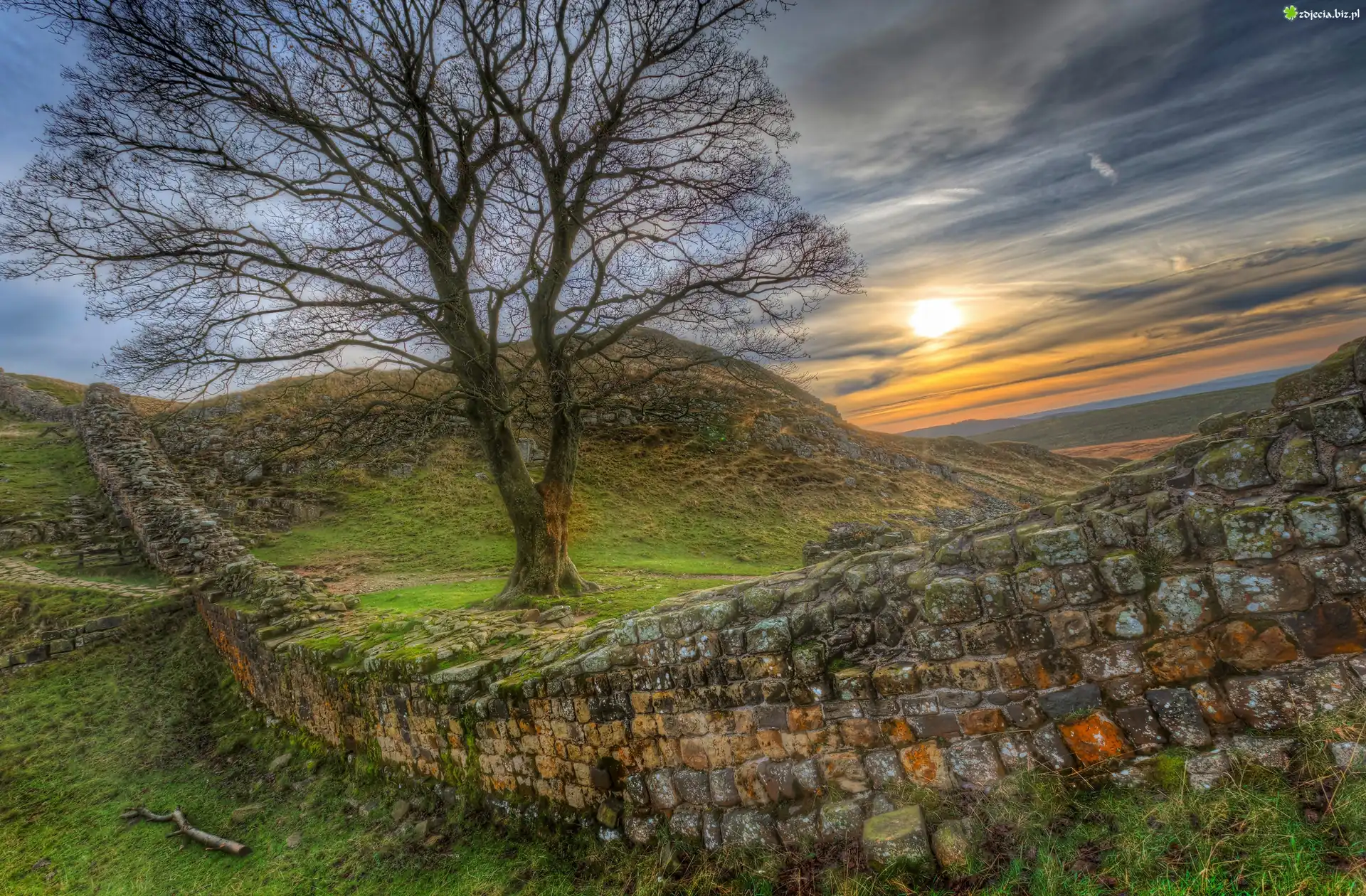 Zdjęcie, Anglia, Wał Hadriana, Mur Hadriana, Drzewo, Trawa, Zachód słońca