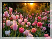 Zdjęcie, Jasnoróżowe, Tulipany, Zachód słońca