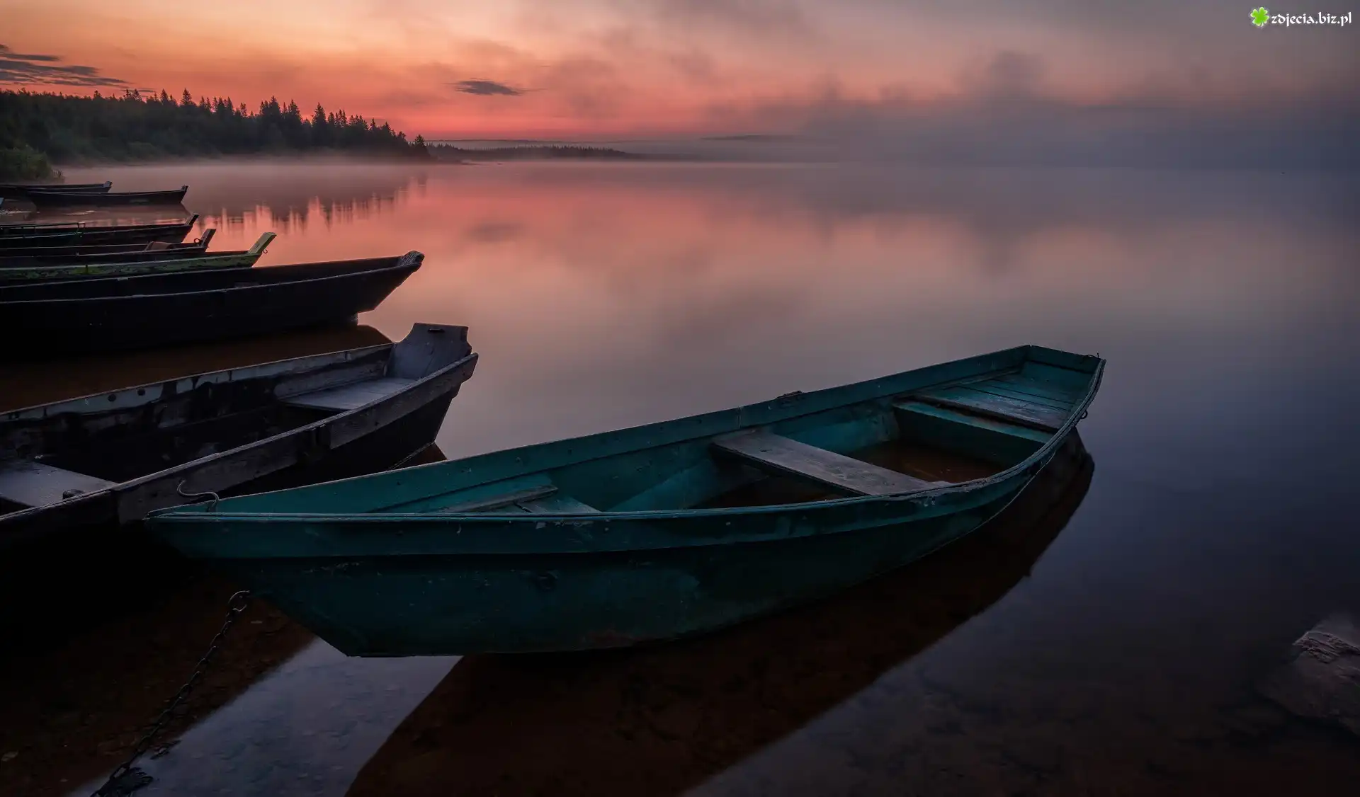 Zdjęcie Jezioro Ziuratkul, Łódki, Mgła, Zachód słońca, Park Narodowy Ziuratkul, Obwód czelabiński, Rosja |