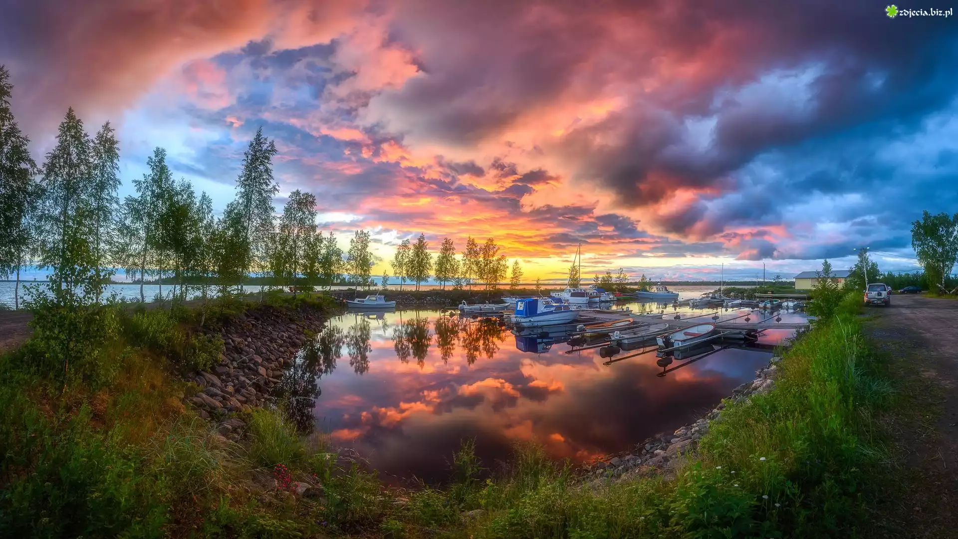 Zdjęcie Zachód słońca, Chmury, Przystań, Motorówki, Droga, Drzewa, Jezioro