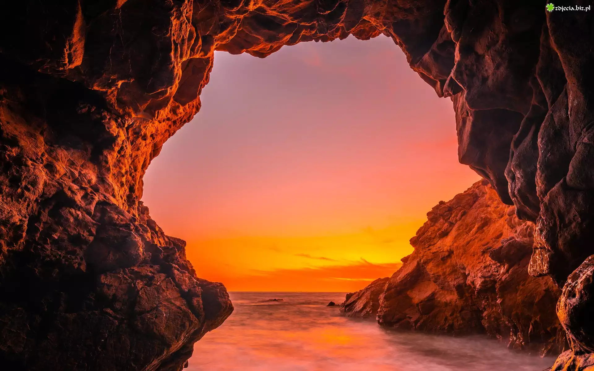 Zdjęcie Stany Zjednoczone, Kalifornia, Malibu, Morze, Jaskinia, Skały, Zachód słońca