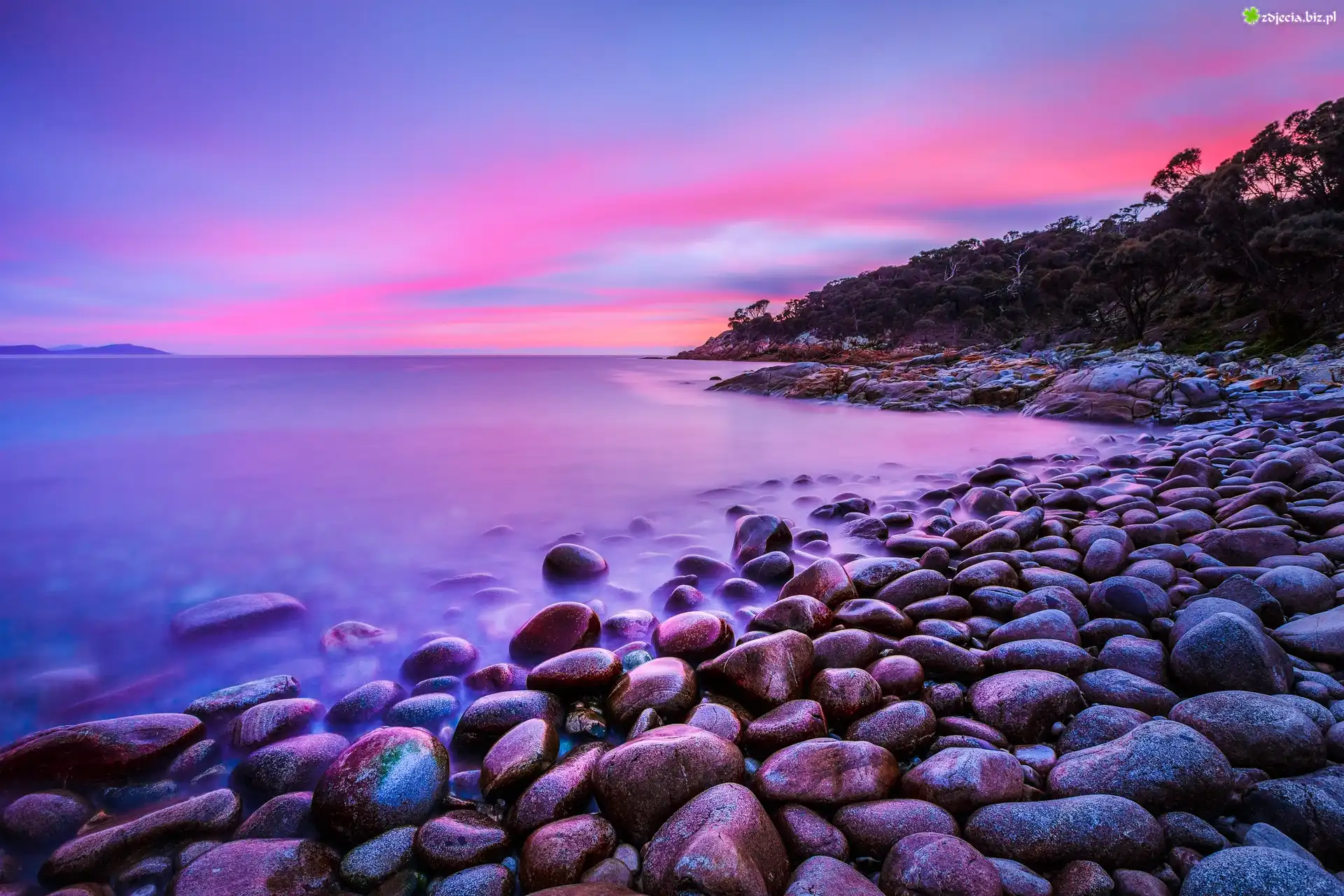 Zdjęcie Morze, Brzeg, Kamienie, Drzewa, Niebo, Różowe, Zachód słońca, Bluestone Bay, Tasmania, Australia |