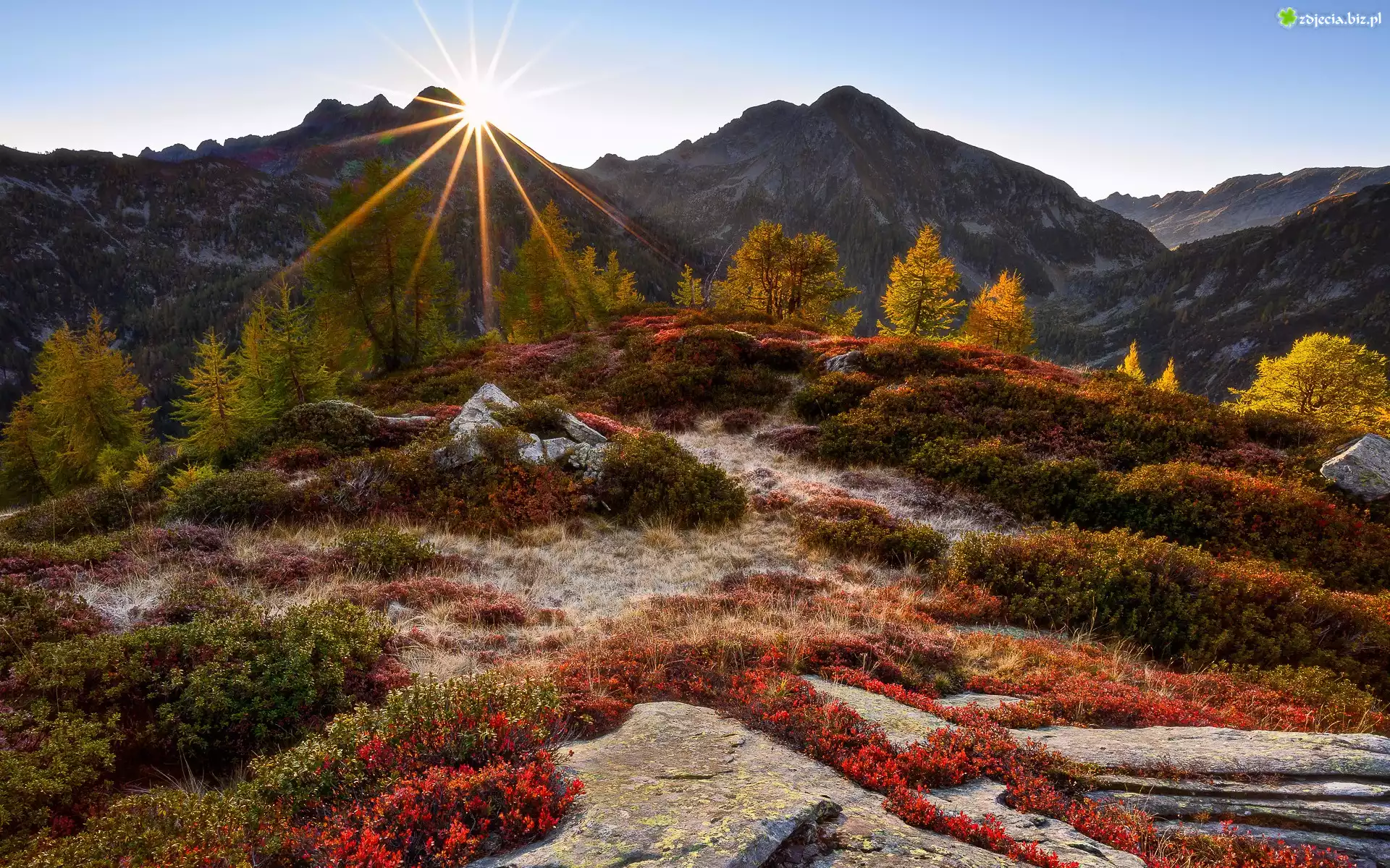 Zdjęcie Jesień, Góry, Kolorowe, Rośliny, Krzewy, Pożółkłe, Drzewa, Promienie słońca