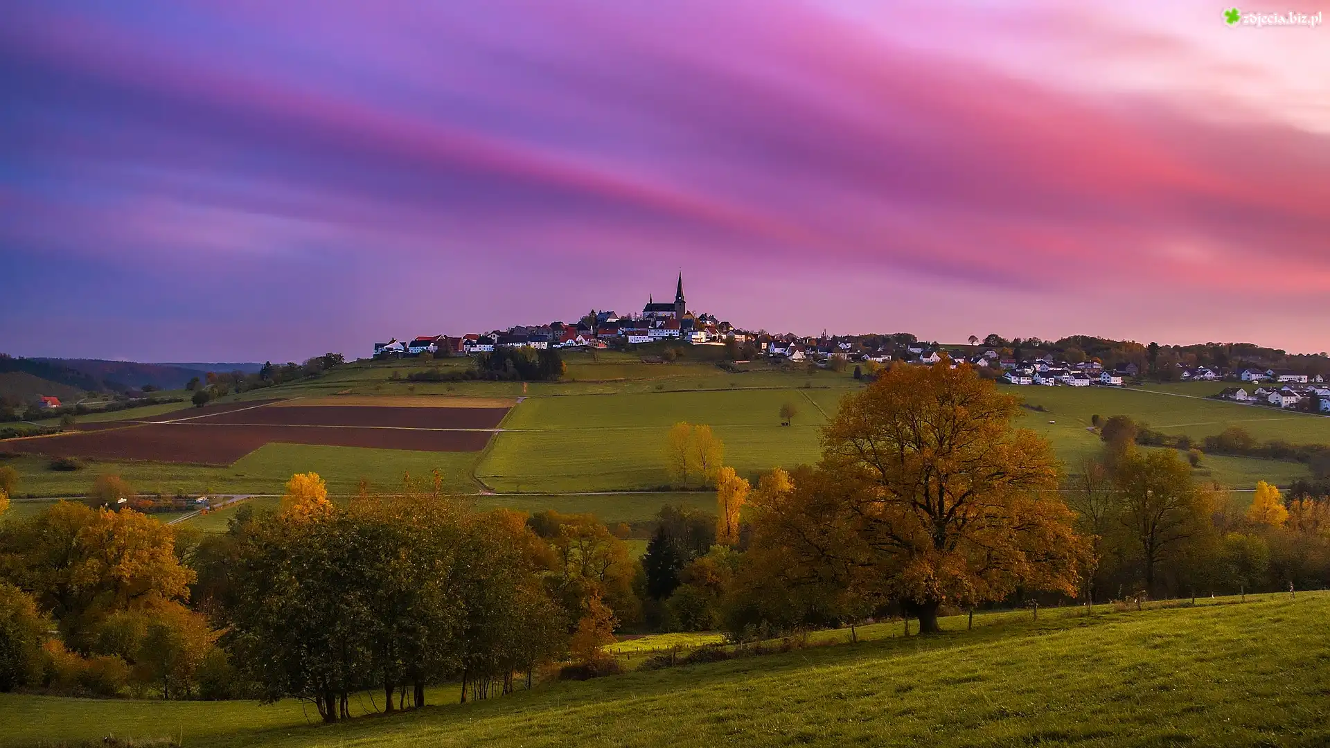 Zdjęcie Zachód słońca, Wieś, Pola, łąki, Drzewa, Budynki, Kościół