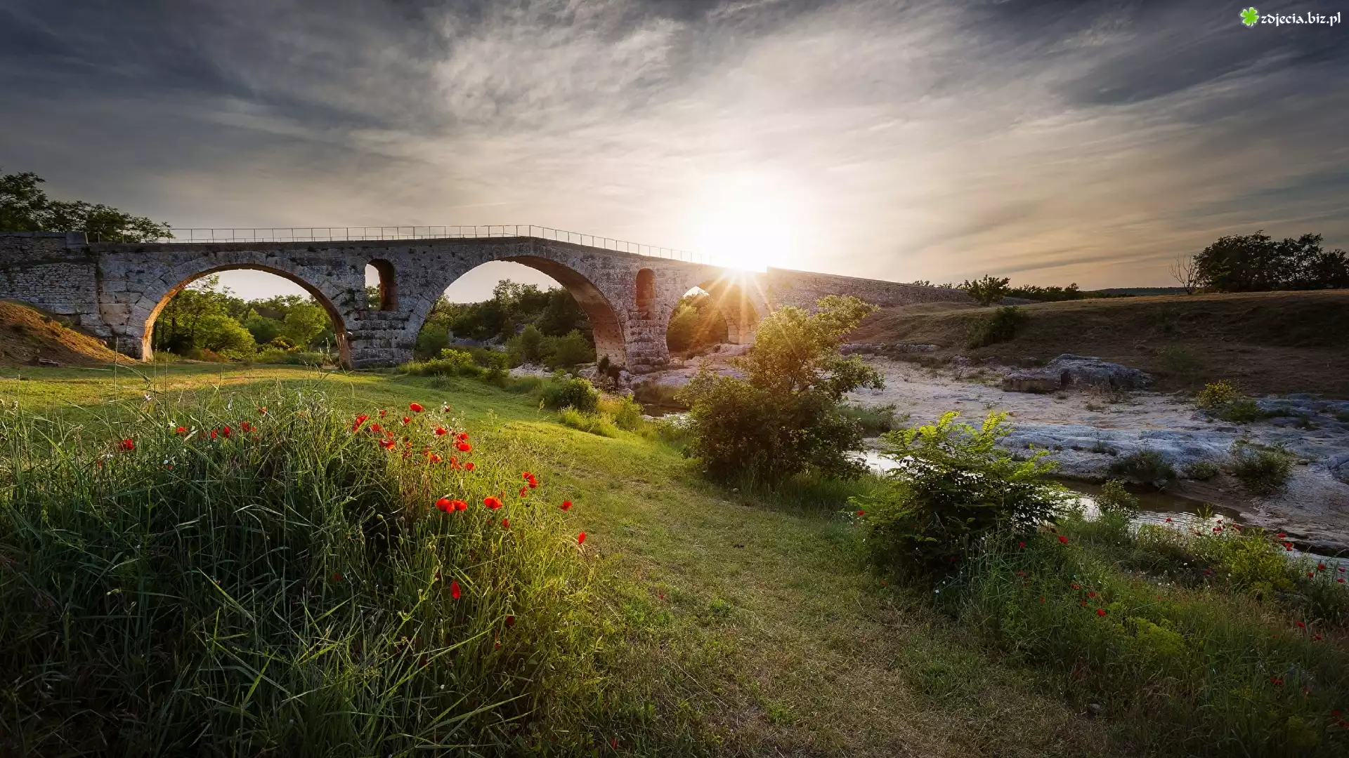 Zdjęcie Wschód słońca, Rzeka, Kamienny, Most, Trawa, Maki, Krzewy