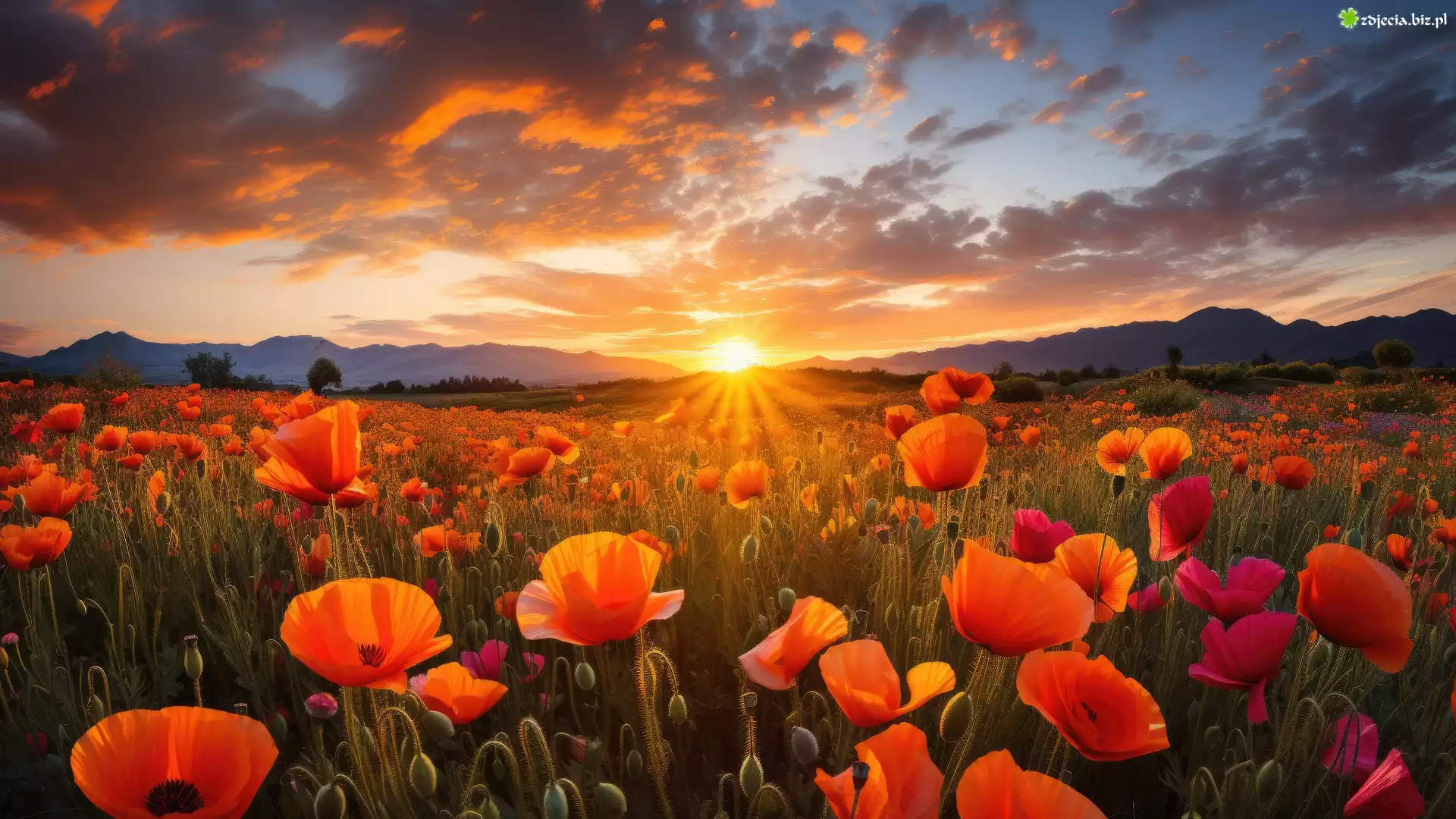 Zdjęcie Kwiaty, Maki, Łąka, Góry, Chmury, Lato, Zachód słońca