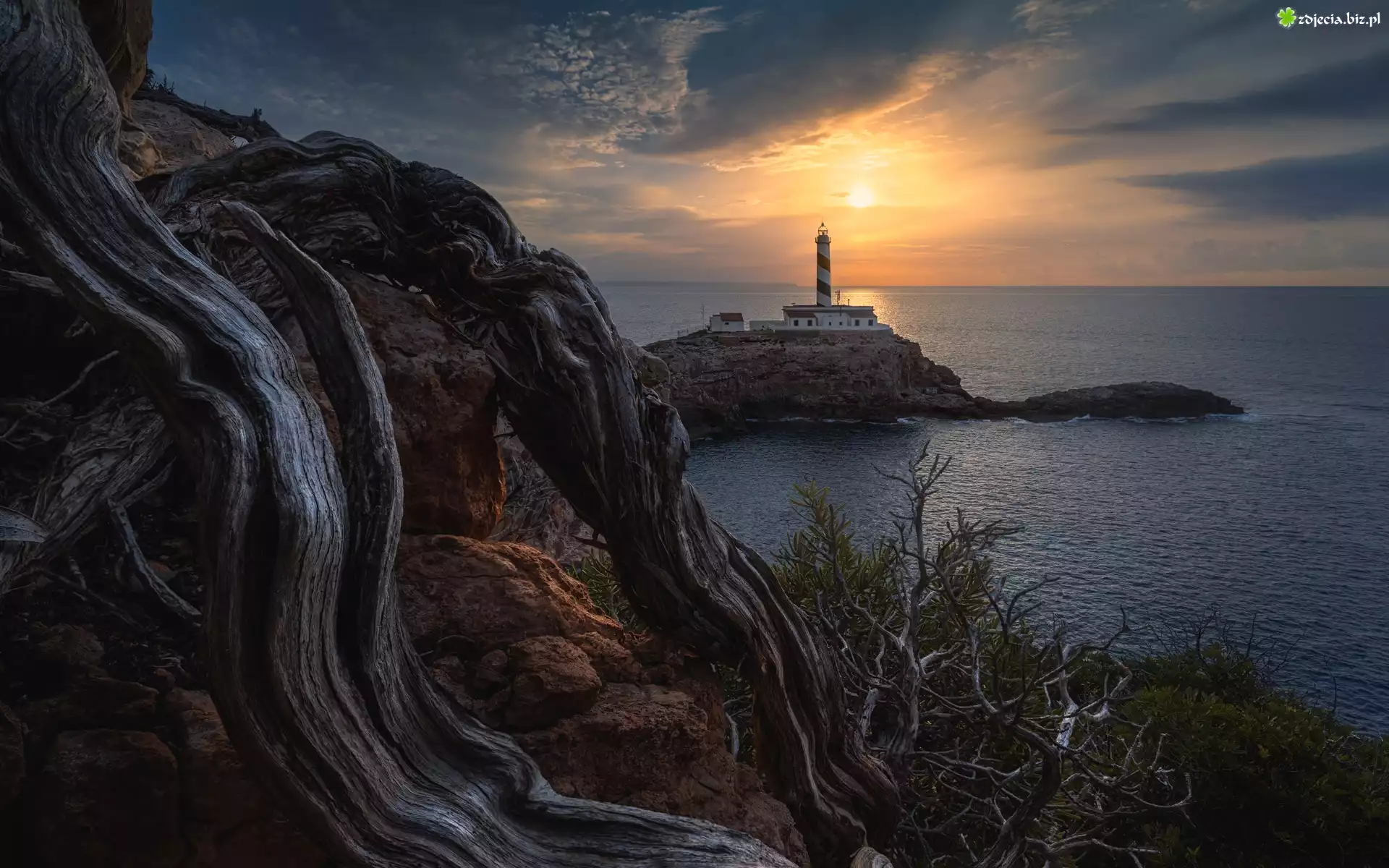 Zdjęcie Morze, Skały, Latarnia morska, Faro de Cala Figuera, Zachód słońca, Majorka, Hiszpania