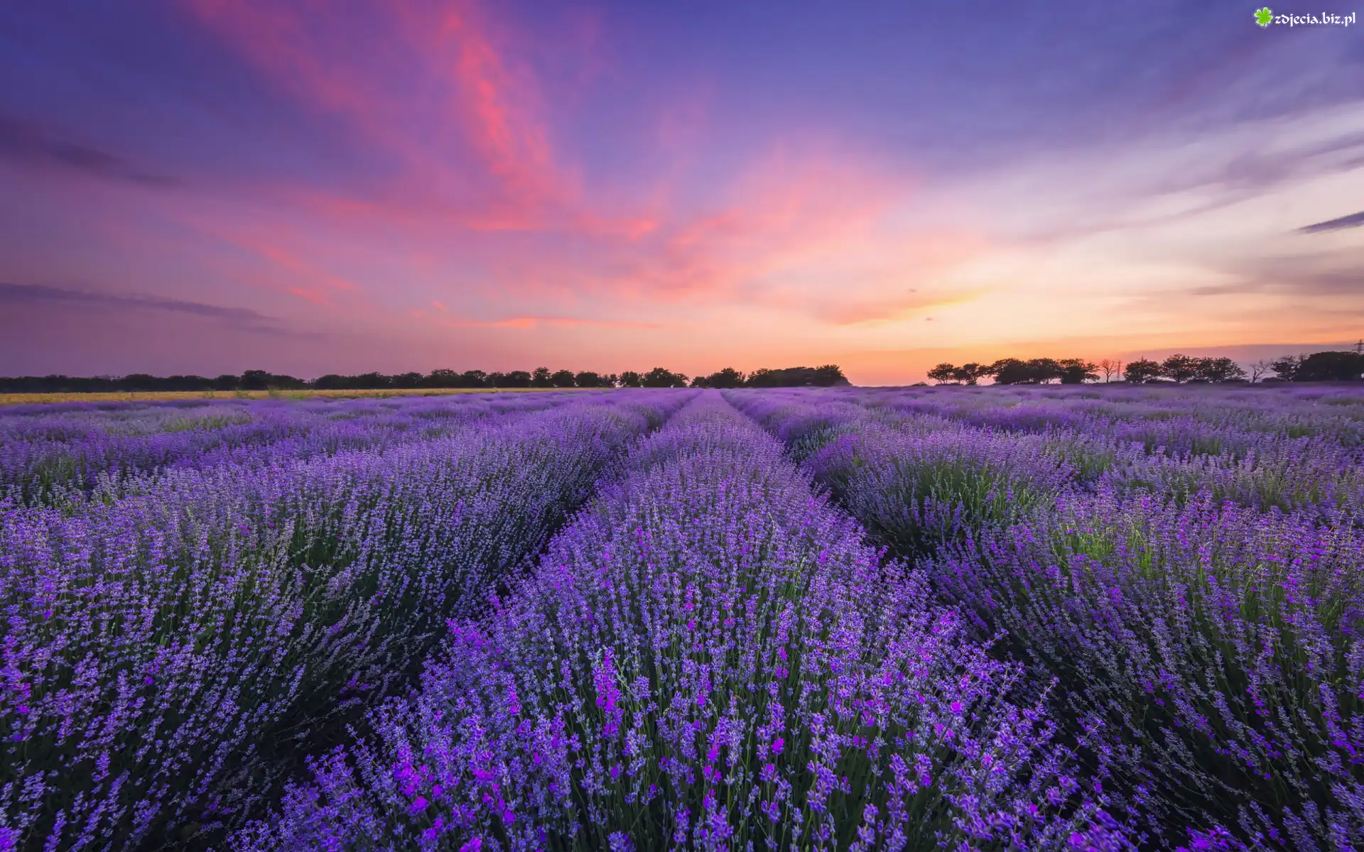 Zdjęcie Pole, Kwiaty, Lawenda, Drzewa, Niebo, Poranek, Wschód słońca