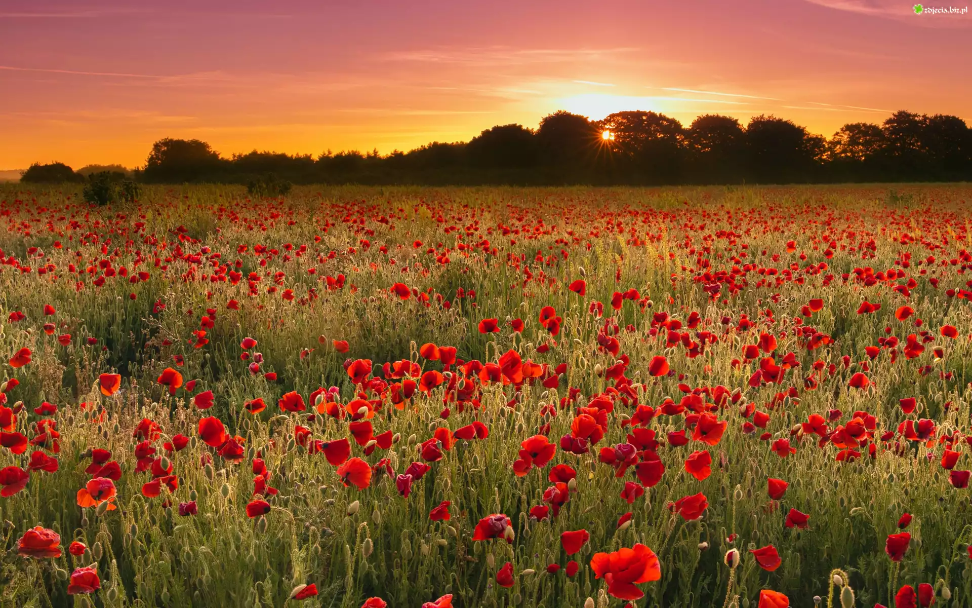Zdjęcie Łąka, Maki, Zachód słońca, Drzewa
