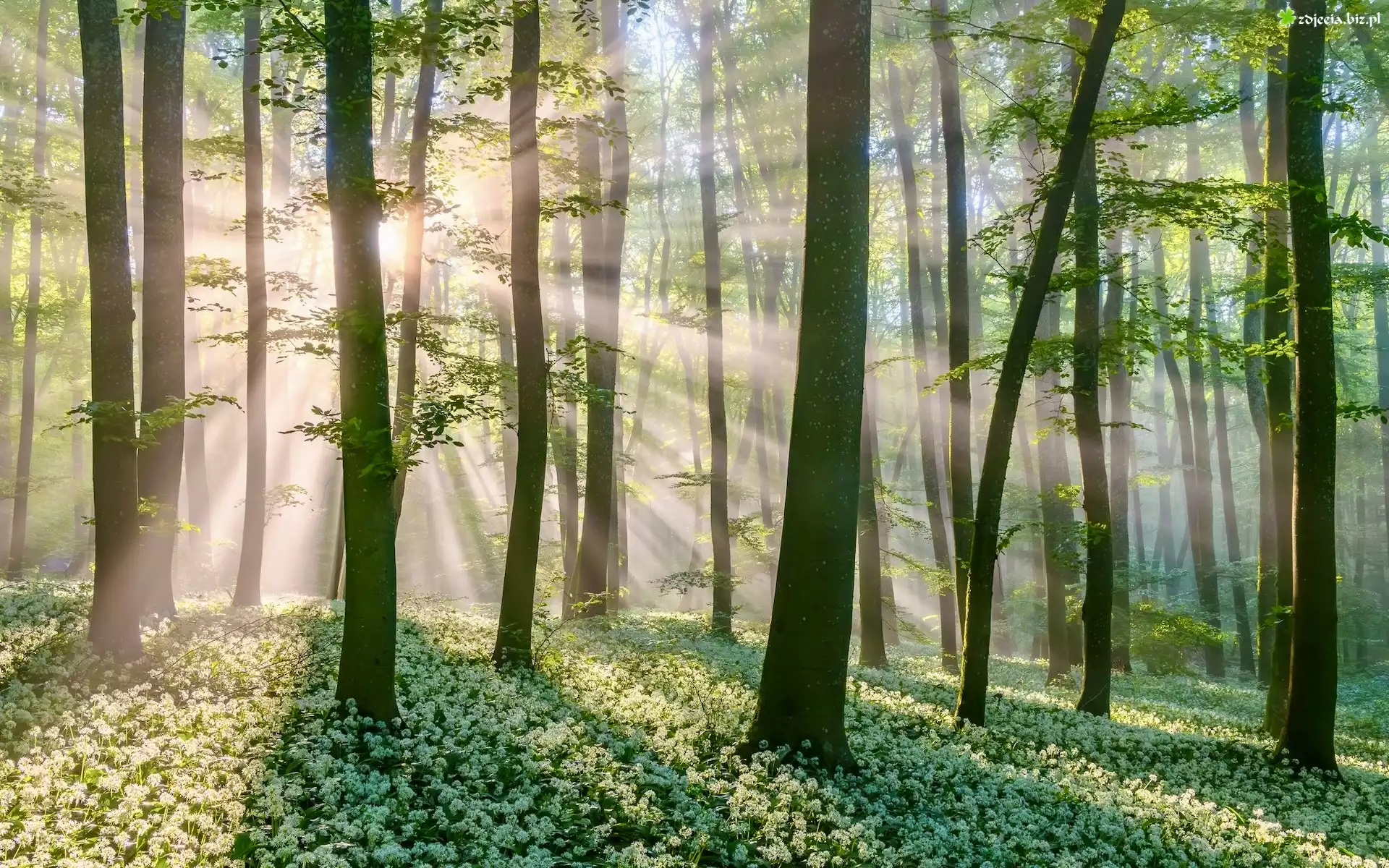 Zdjęcie Las, Drzewa, Promienie słońca, Czosnek niedźwiedzi