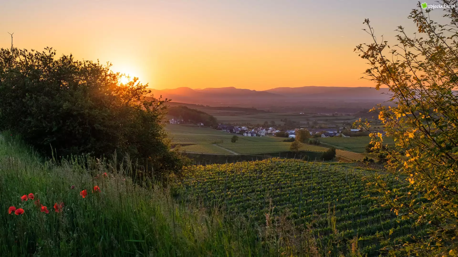 Zdjęcie, Wschód słońca, Łąka, Maki, Krzewy, Winnice, Kaiserstuhl, Niemcy