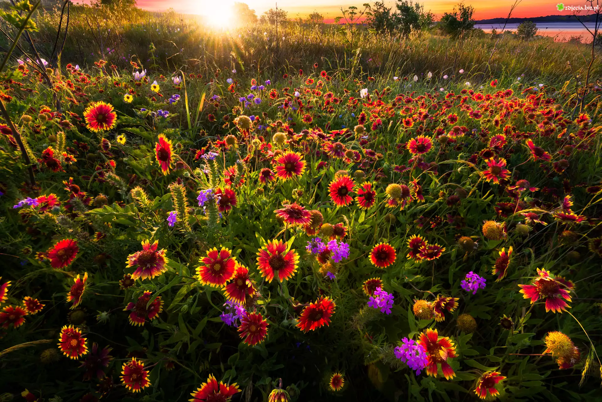 Zdjęcie Łąka, Pole, Kwiaty, Kolorowe, Trawa, Drzewa, Zachód słońca