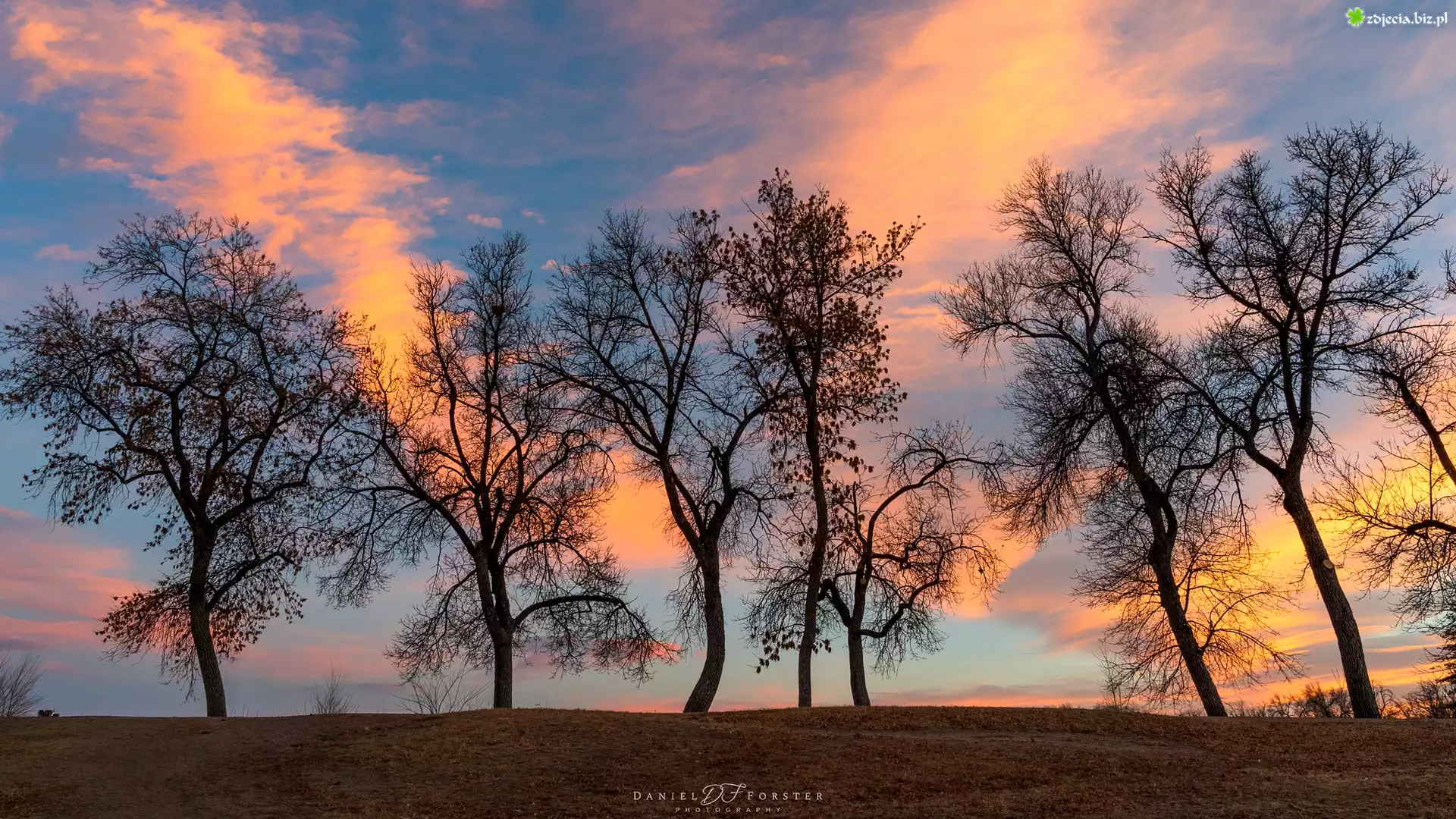 Zdjęcie Zachód słońca, Rozświetlone, Chmury, Drzewa