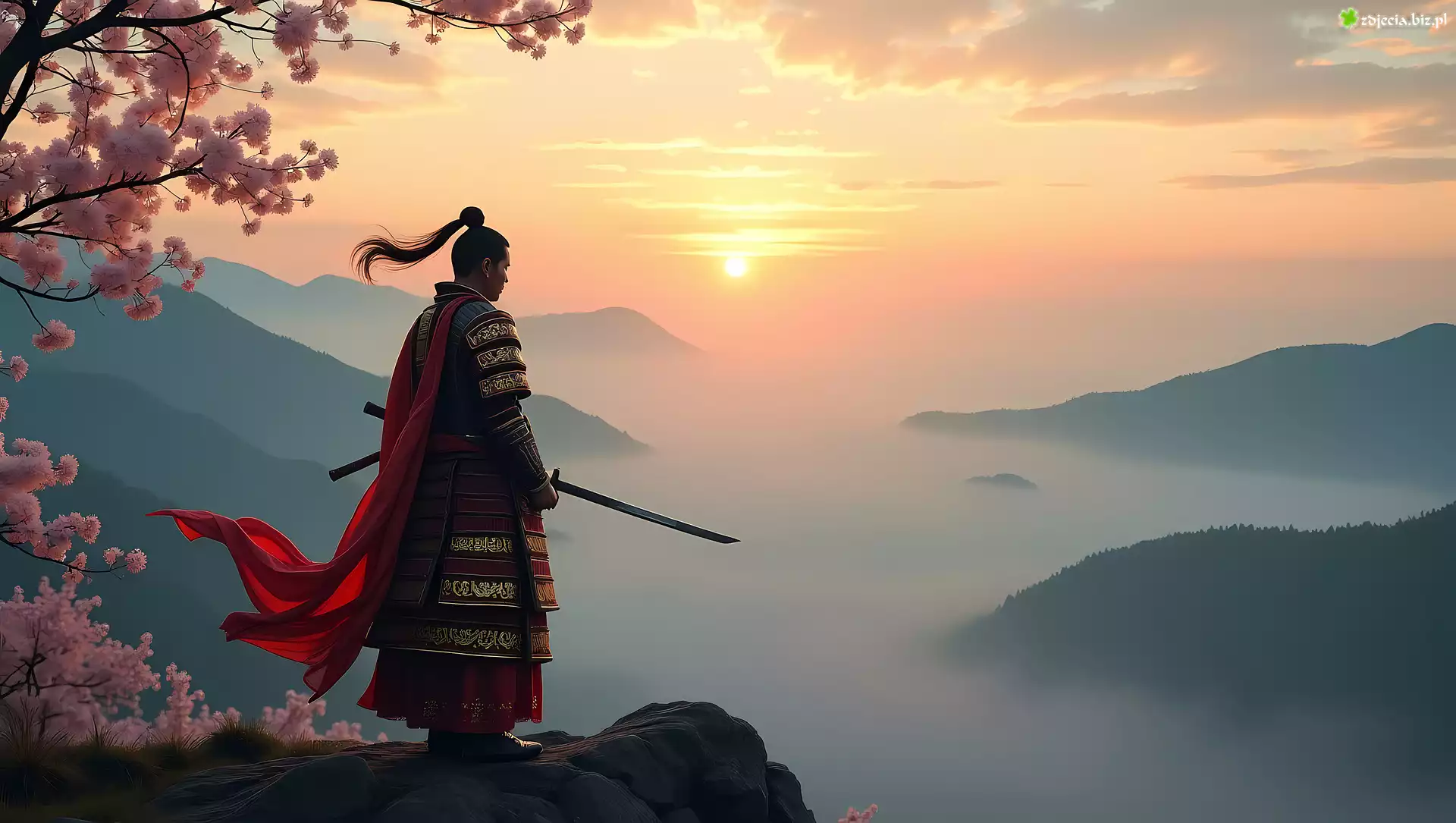 Zdjęcie Wojownik, Miecz, Skała, Drzewo, Góry, Mgła, Zachód słońca