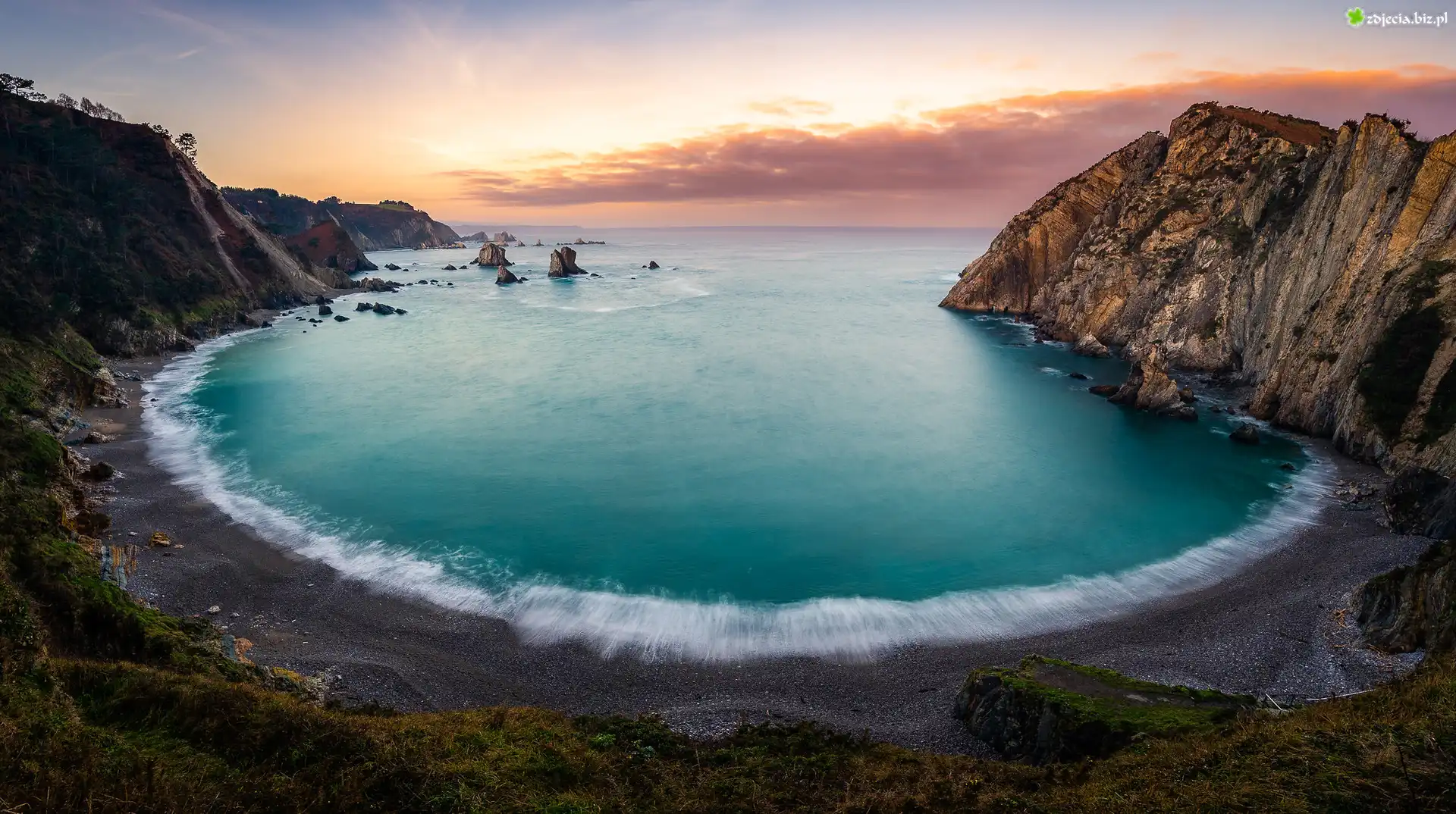 Zdjęcie Morze, Zachód słońca, Góry, Skały, Plaża, Playa del Silencio, Asturia, Hiszpania