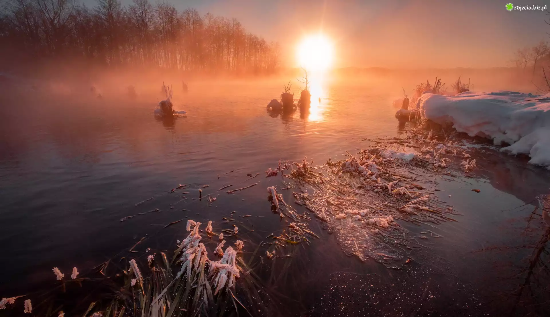 Zdjęcie, Zima, Zachód słońca, Jezioro Szaturskie, Drzewa, Mgła, Shatura, Obwód moskiewski, Rosja