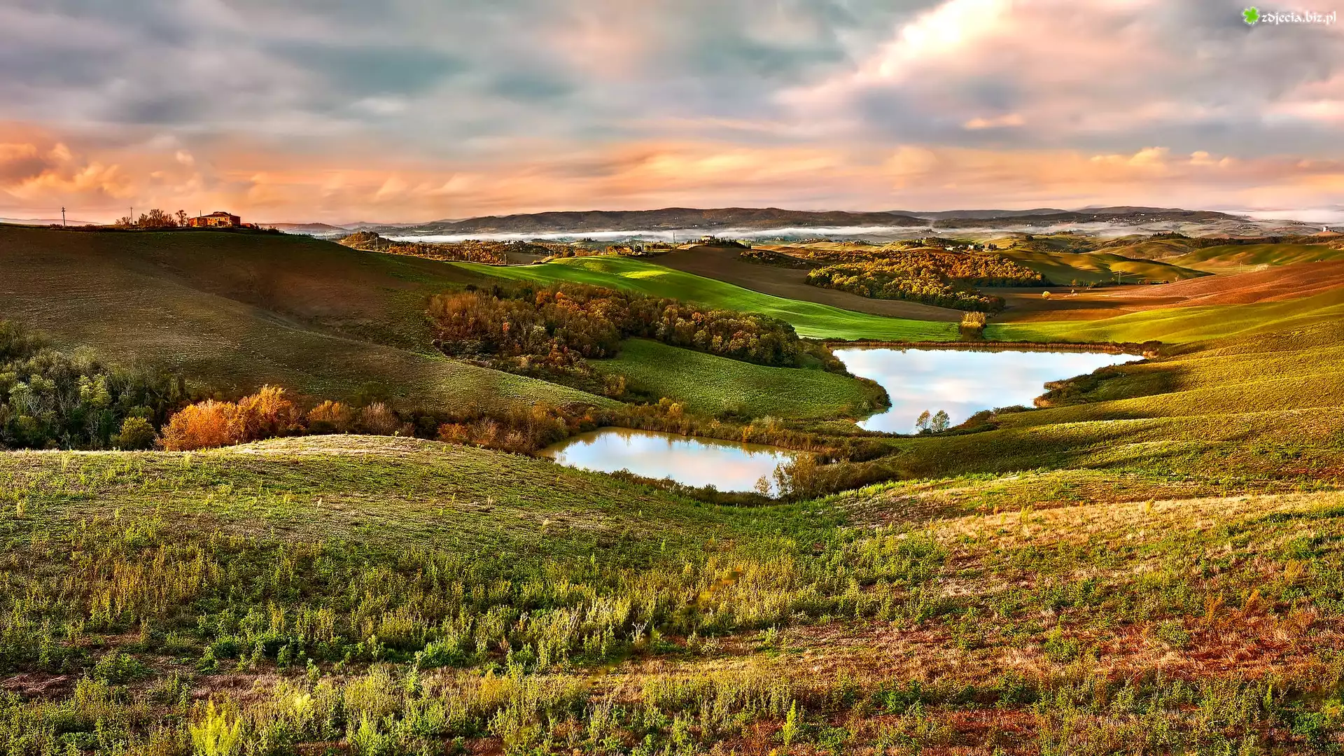 Zdjęcie Zachód słońca, Wzgórza, Jeziora, Roślinność, Mucigliani, Toskania, Włochy