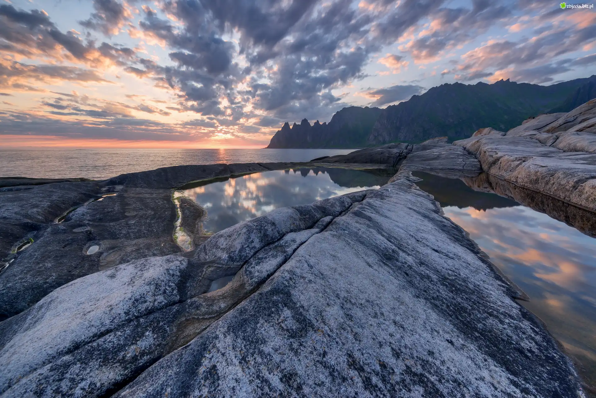 Zdjęcie, Wschód słońca, Skały, Morze, Wyspa Senja, Norwegia