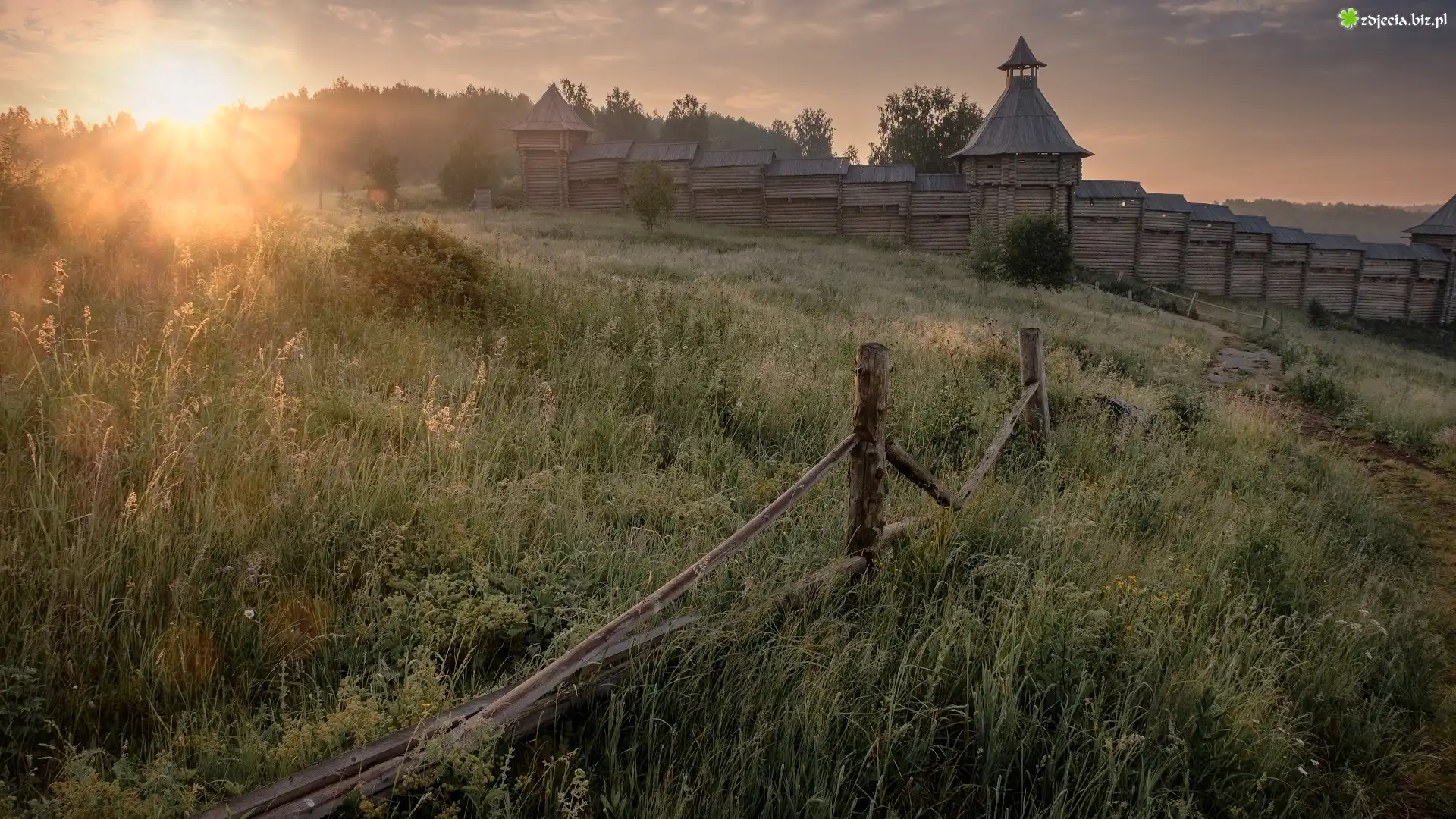 Zdjęcie Wschód słońca, Łąka, Ogrodzenie, Drewniana, Budowla, Wieże