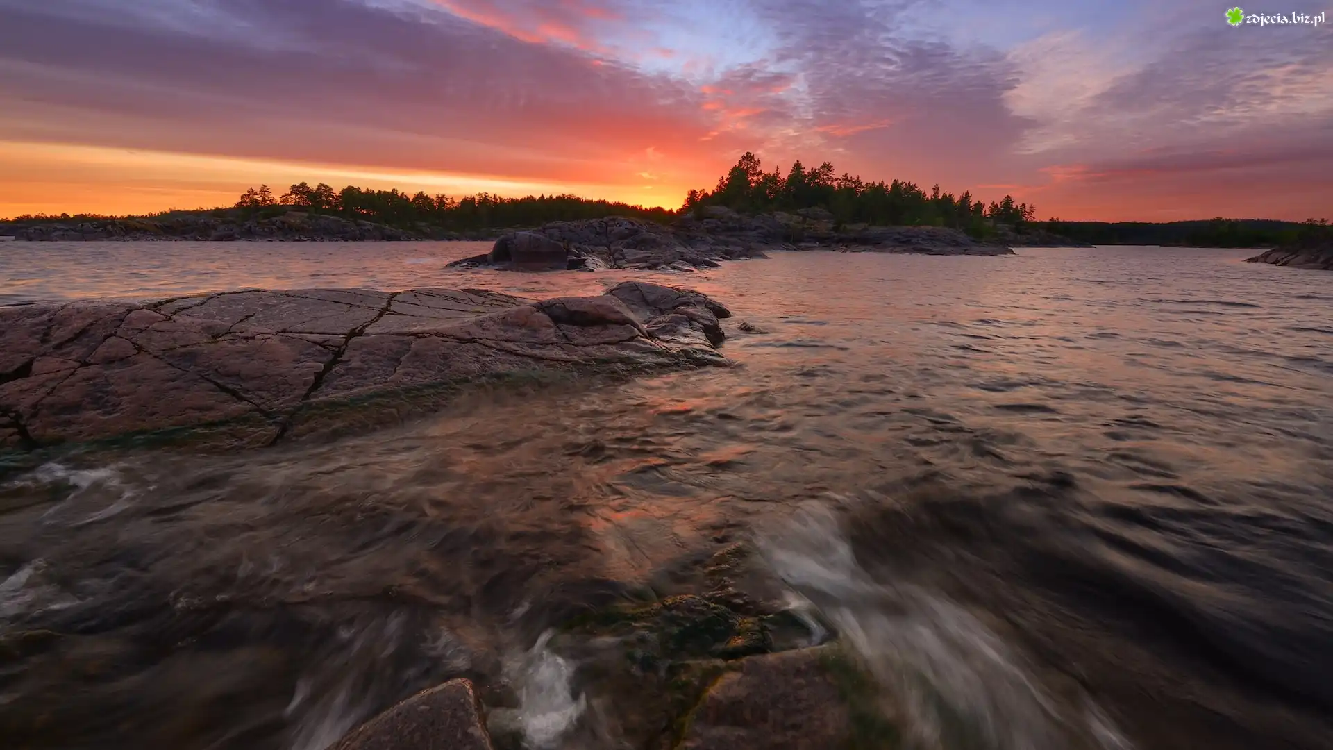 Zdjęcie Jezioro Ładoga, Karelia, Rosja, Wysepka, Skały, Drzewa, Chmury, Zachód słońca