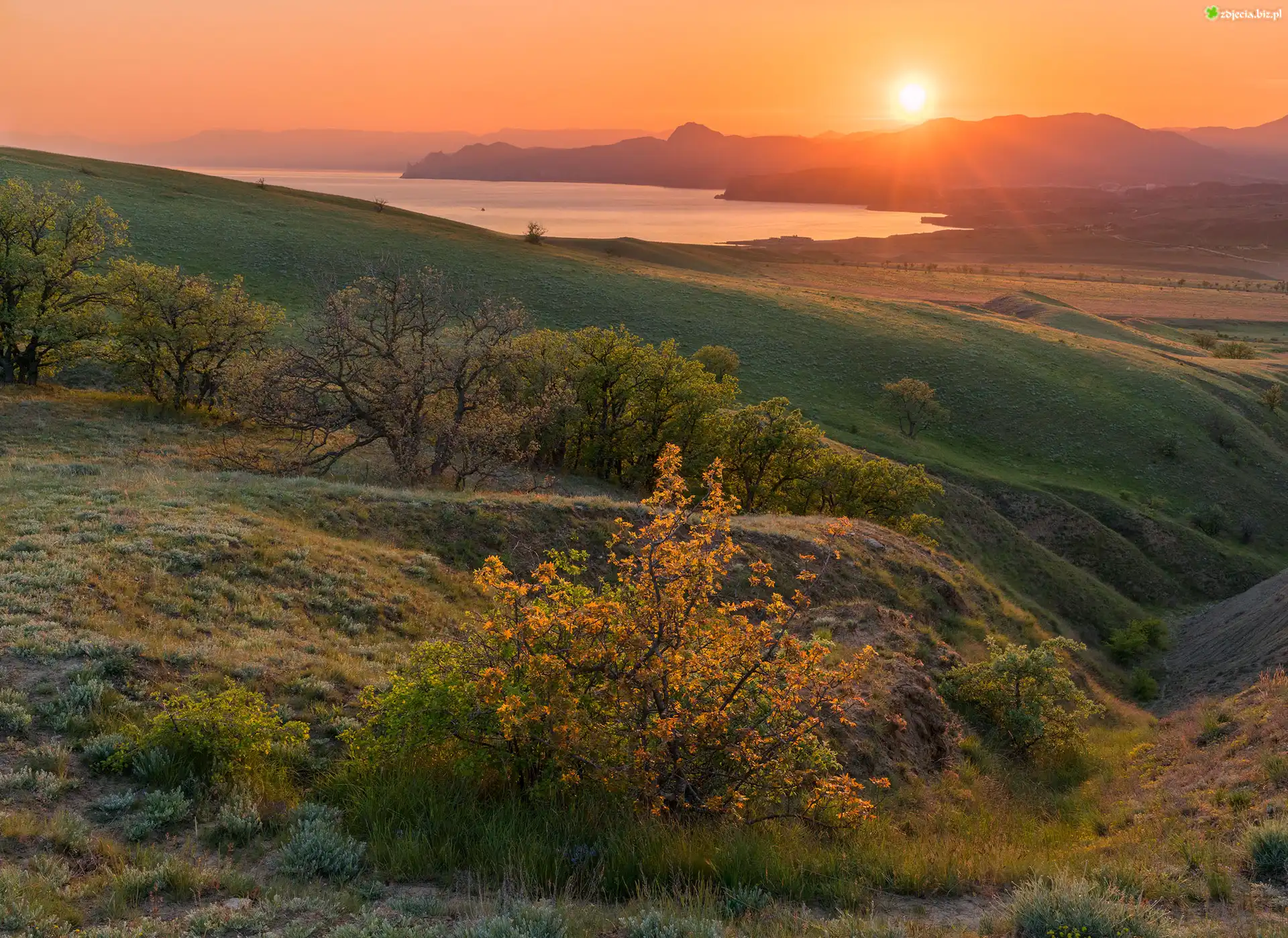 Zdjęcie Rosja, Krym, Morze Czarne, Wzgórza, Przylądek Meganom, Drzewa, Promienie słońca