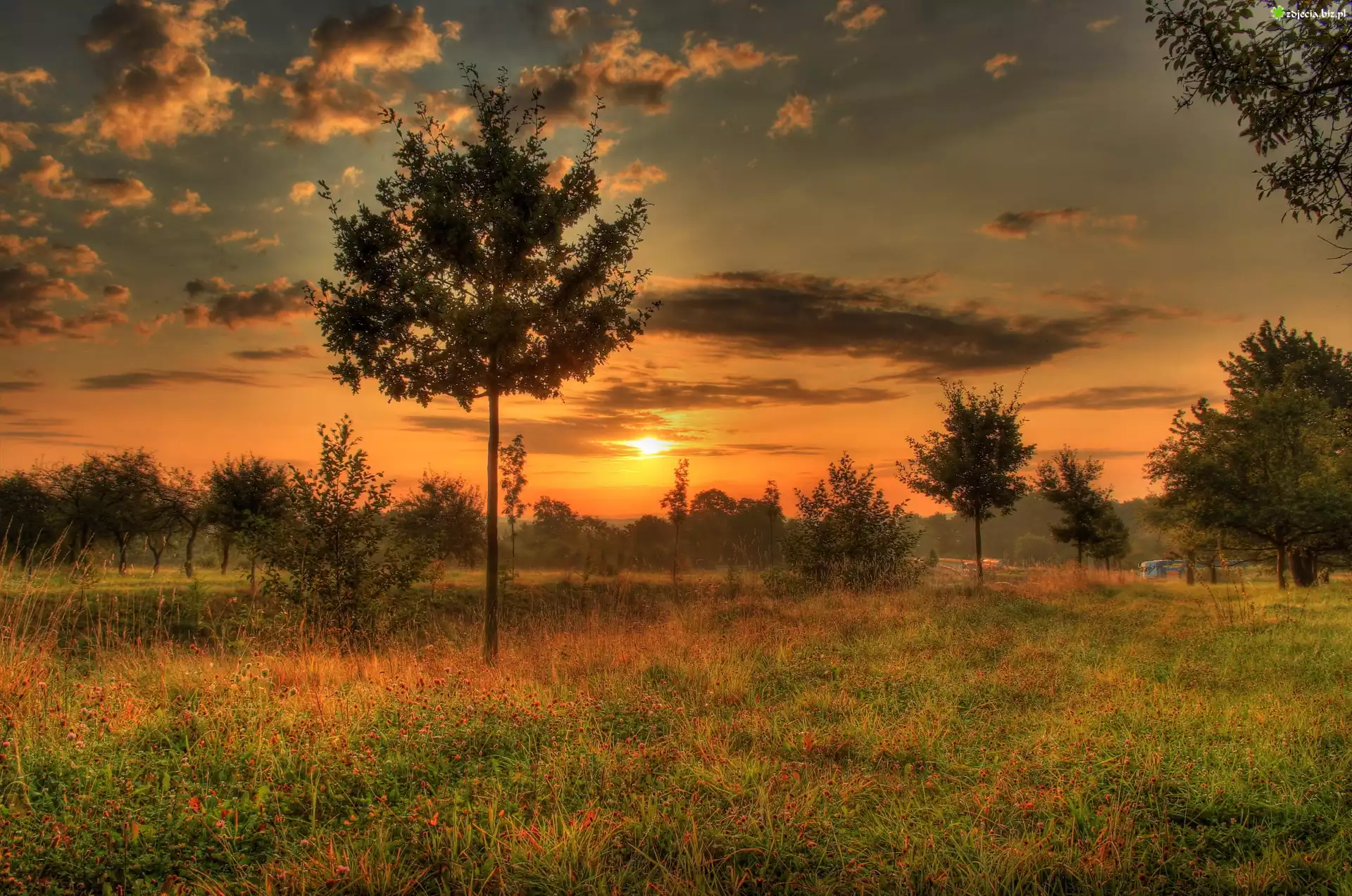 Zdjęcie Łąka, Zachód, Słońca, Drzewka