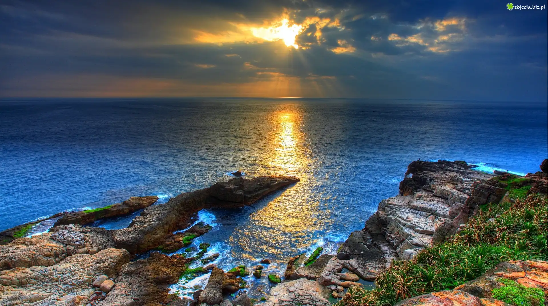 Zdjęcie Zachód Słońca, Promienie, Odbicie, Morze, Skalisty Brzeg