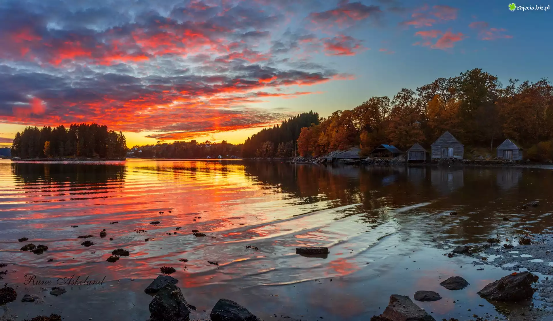 Zdjęcie Jezioro, Drzewa, Zachód słońca, Chmury, Kolorowe, Niebo