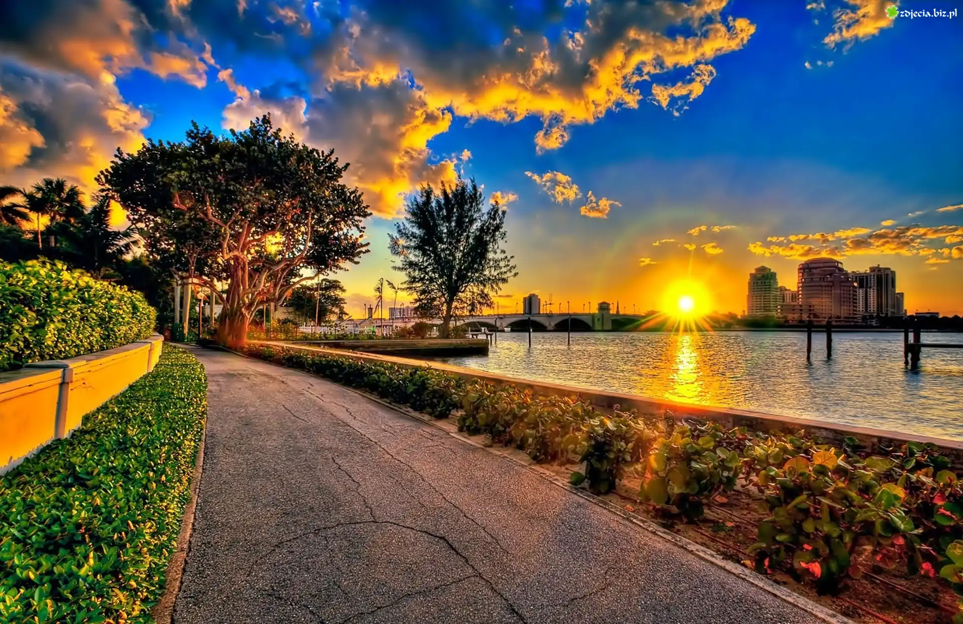 Zdjęcie Zachód Słońca, Rzeka, Most, Droga, Drzewa, Miasto
