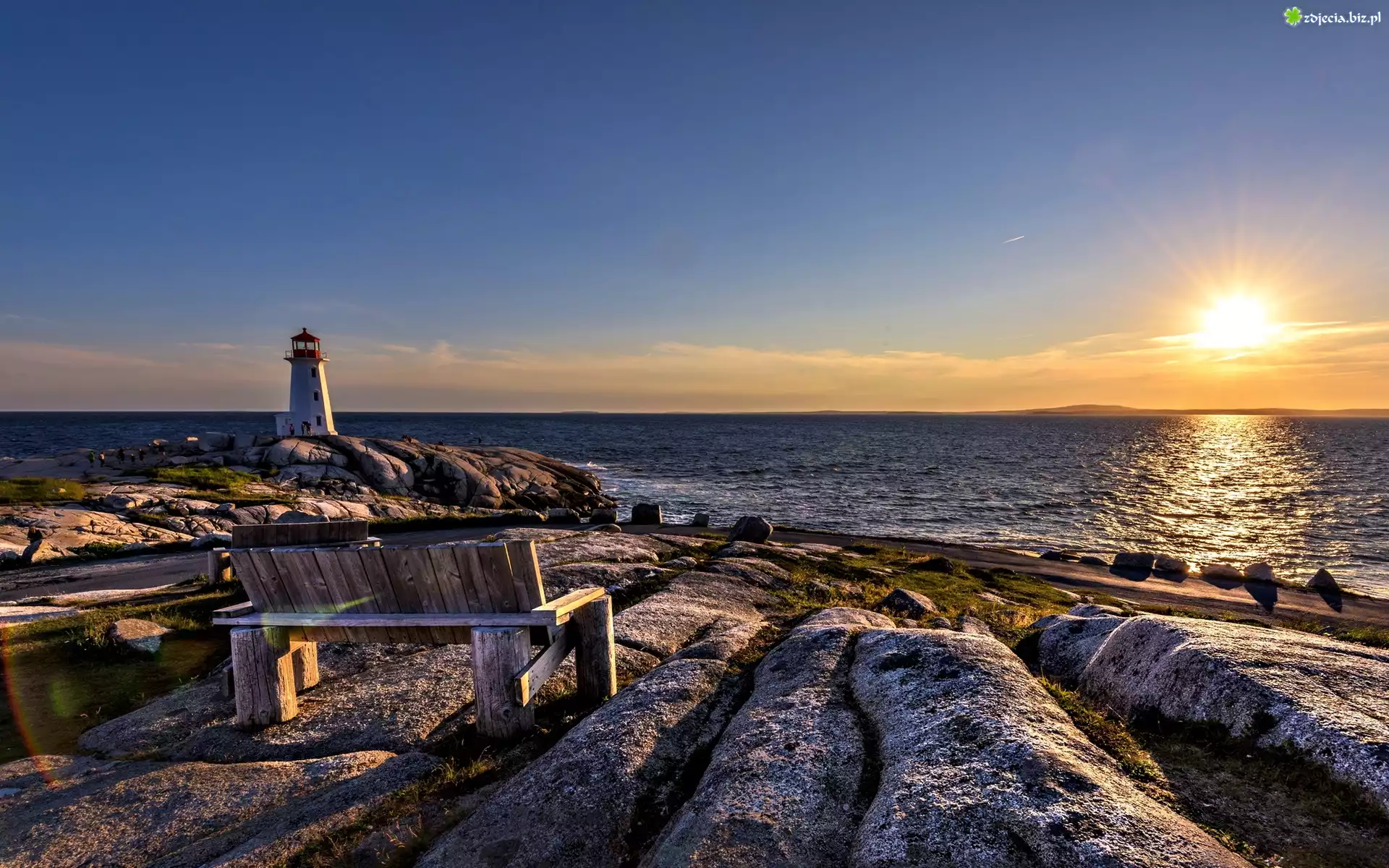 Zdjęcie Zachód Słońca, Morze, Skałki, Ławka, Latarnia Morska
