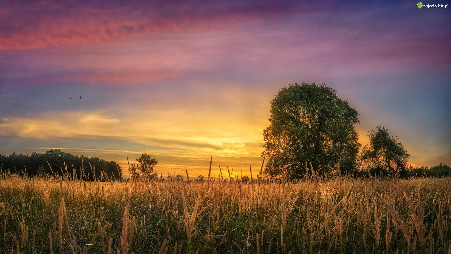 Zdjęcie Zachód słońca, Trawa, Kwiaty, Drzewo, Ptaki, Niebo