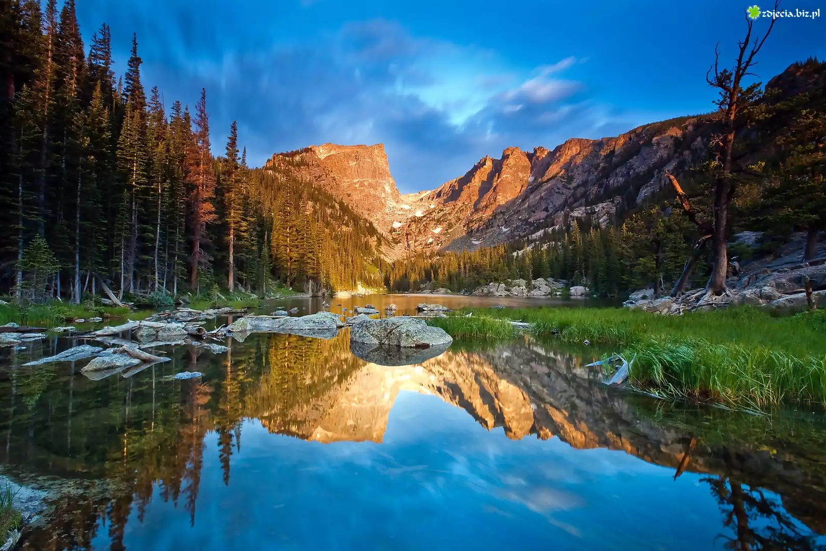 Zdjęcie Zachód, Słońca, Góry, Jezioro, Głazy, Las, Odbicie