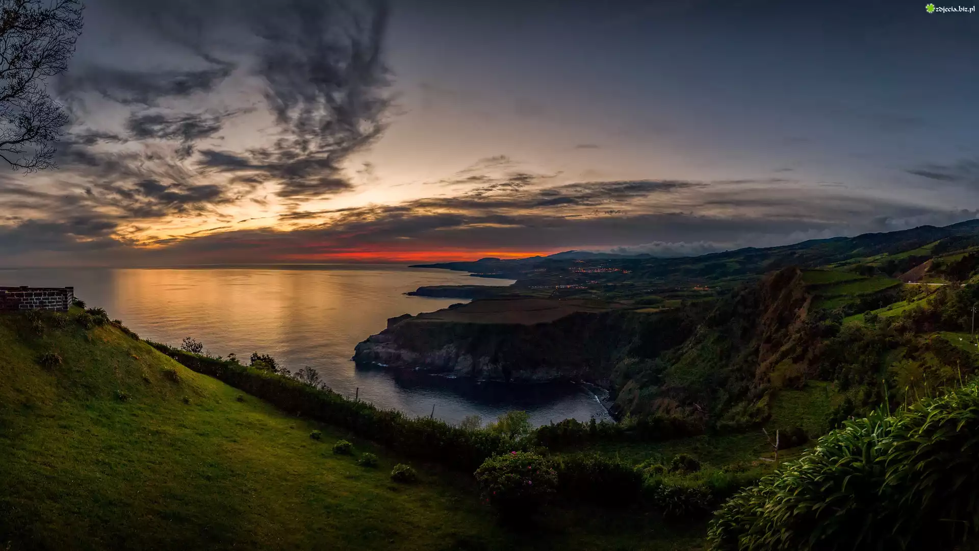 Zdjęcie Zachód, Słońca, Wzgórek, Balustrada, Morze, Trawa, Roślinność