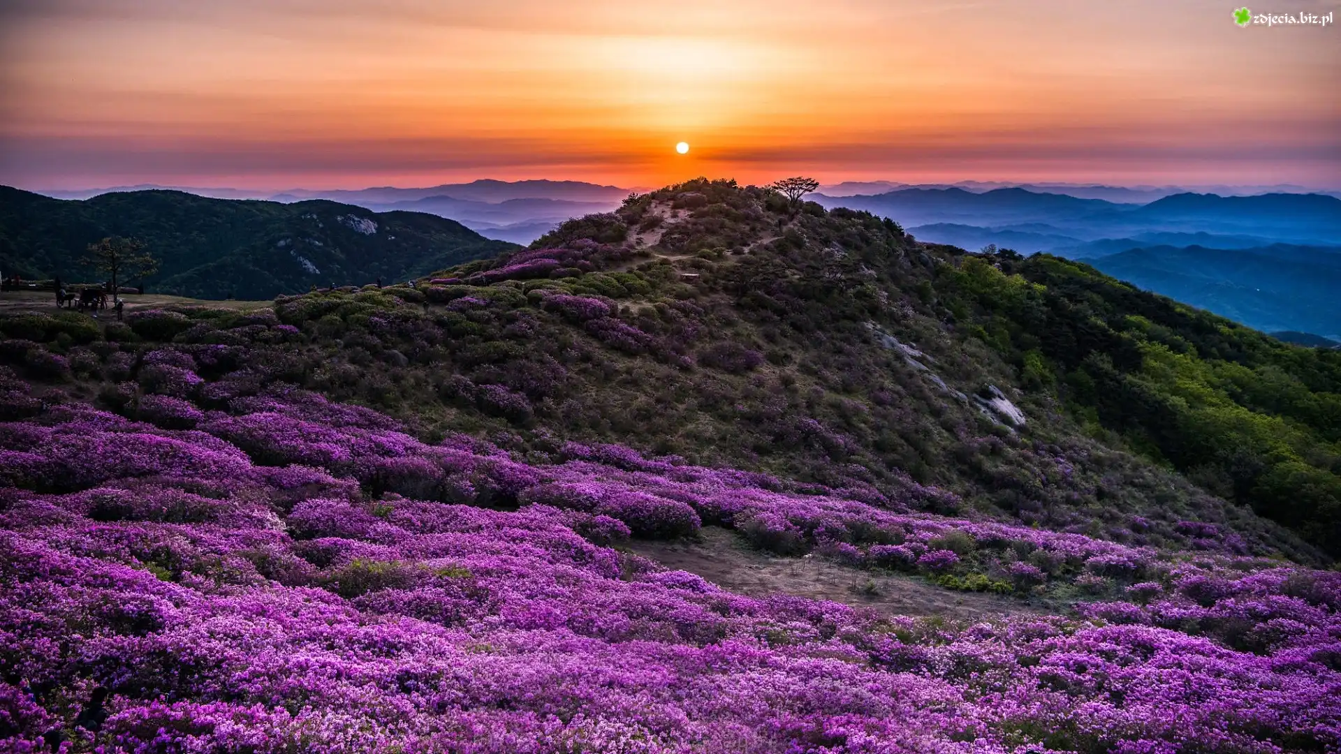 Zdjęcie Zachód słońca, Góry, Drzewa, Kwiaty, Wrzosy, Wrzosowisko
